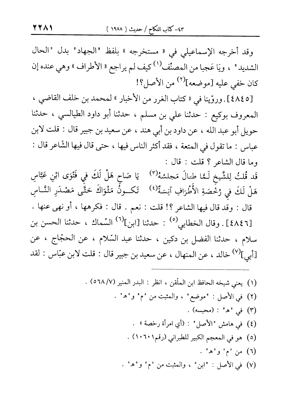 [4845]- وروّينا في "كتاب الغرر من الأخبار" لمحمد بن خلف القاضي، المعروف بوكيع: حدثنا علي بن مسلم، حدثنا أبو داود الطيالسي، حدثنا حويل أبو عبد الله، عن داود بن أبي هند، عن سعيد بن جبير قال: قلت لابن عباس: ما تقول في المتعة، فقد أكثر الناس فيها، حتى قال فيها الشّاعر قال: وما قال الشاعر؟ قلت: قال: