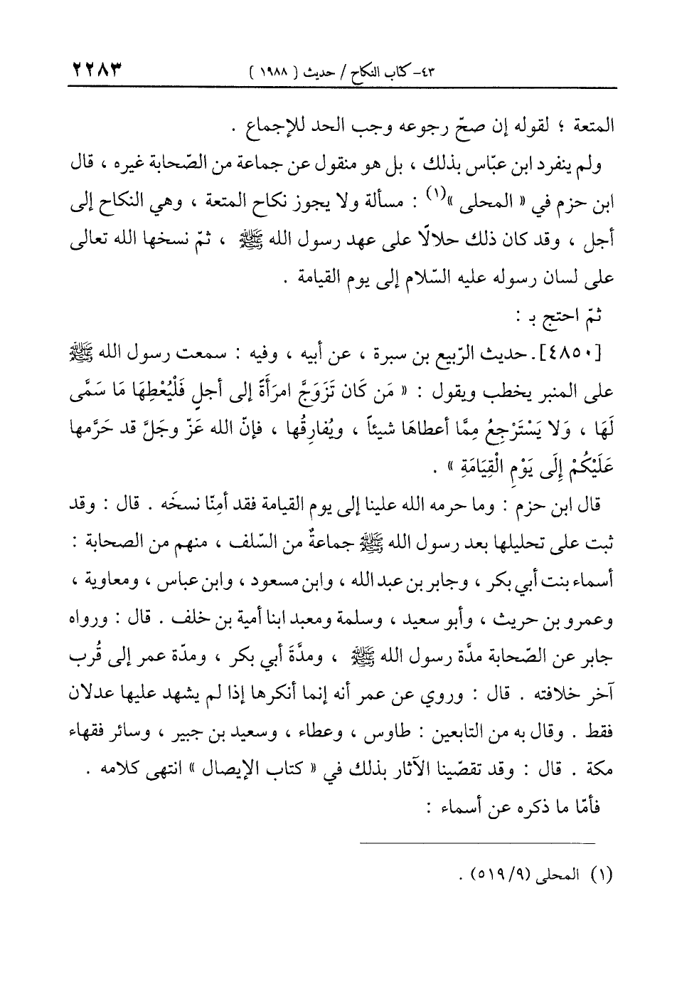 قال ابن حزم: وما حرمه الله علينا إلى يوم القيامة فقد أمِنّا نسخَه. قال: وقد ثبت على تحليلها بعد رسول الله - صلى الله عليه وسلم - جماعةٌ من السّلف، منهم من الصحابة: أسماء بنت أبي بكر، وجابر بن عبد الله، وابن مسعود، وابن عباس، ومعاوية، وعمرو بن حريث، وأبو سعيد، وسلمة ومعبد ابنا أمية بن خلف. قال: ورواه جابر عن الصّحابة مدَّة رسول الله - صلى الله عليه وسلم -، ومدَّةَ أبي بكر، ومدَّة عمر إلى قُرب آخر خلافته. قال: وروي عن عمر أنه إنما أنكرها إذا لم يشهد عليها عدلان فقط. وقال به من التابعين: طاوس، وعطاء، وسعيد بن جبير، وسائر فقهاء مكة. قال: وقد تقصّينا الآثار بذلك في "كتاب الإيصال" انتهى كلامه.
