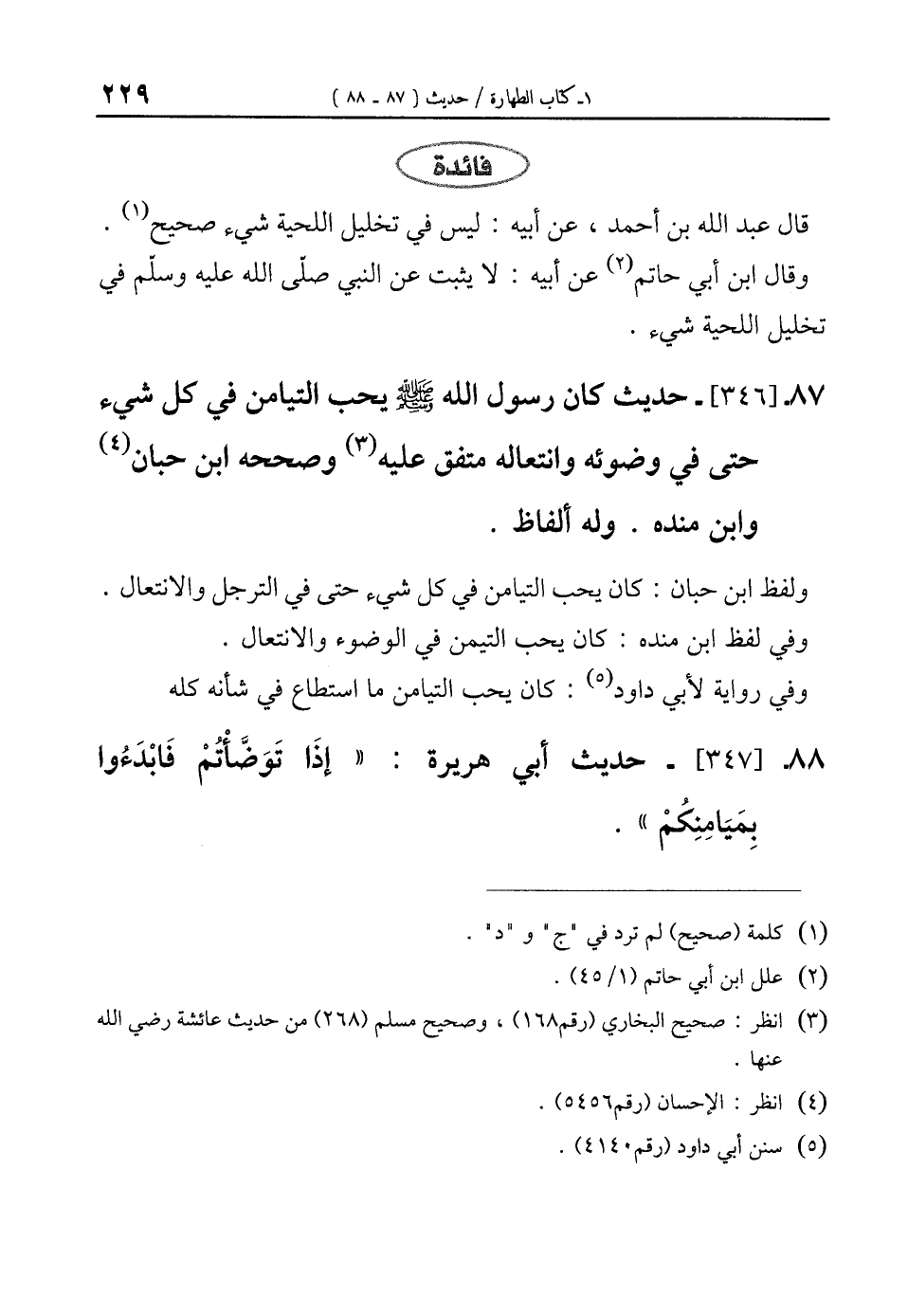 87 - [346]- حديث كان رسول الله - صلى الله عليه وسلم - يحب التيامن في كل شيء حتى في وضوئه وانتعاله متفق عليه (¬3) وصححه ابن حبان (¬4) وابن منده. وله ألفاظ.