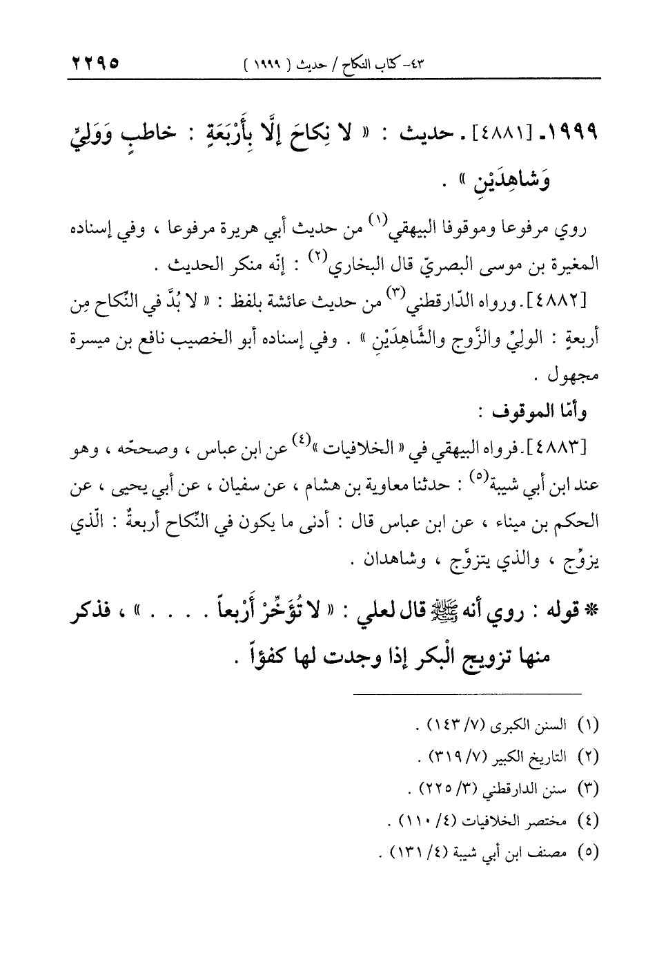 1999 - [4881]- حديث: "لا نِكاحَ إلَّا بِأَرْبَعَةٍ: خاطبٍ وَوَلِيٍّ وَشاهِدَيْنِ".