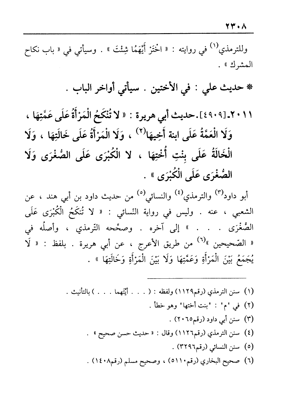2011 - [4909]- حديث أبي هريرة: "لا تنْكَحُ الْمَرْأَةُ عَلَى عَمَّتِهَا، وَلاَ الْعَمَّةُ عَلَى ابنة أَخِيهَا (¬2)، وَلاَ الْمَرْأَةُ عَلَى خَالَتِهَا، وَلاَ الْخَالَةُ عَلَى بِنْتِ أُخْتِهَا، لا الْكُبْرَى عَلَى الصُّغْرَى وَلاَ الصُّغْرَى عَلَى الْكُبْرَى".