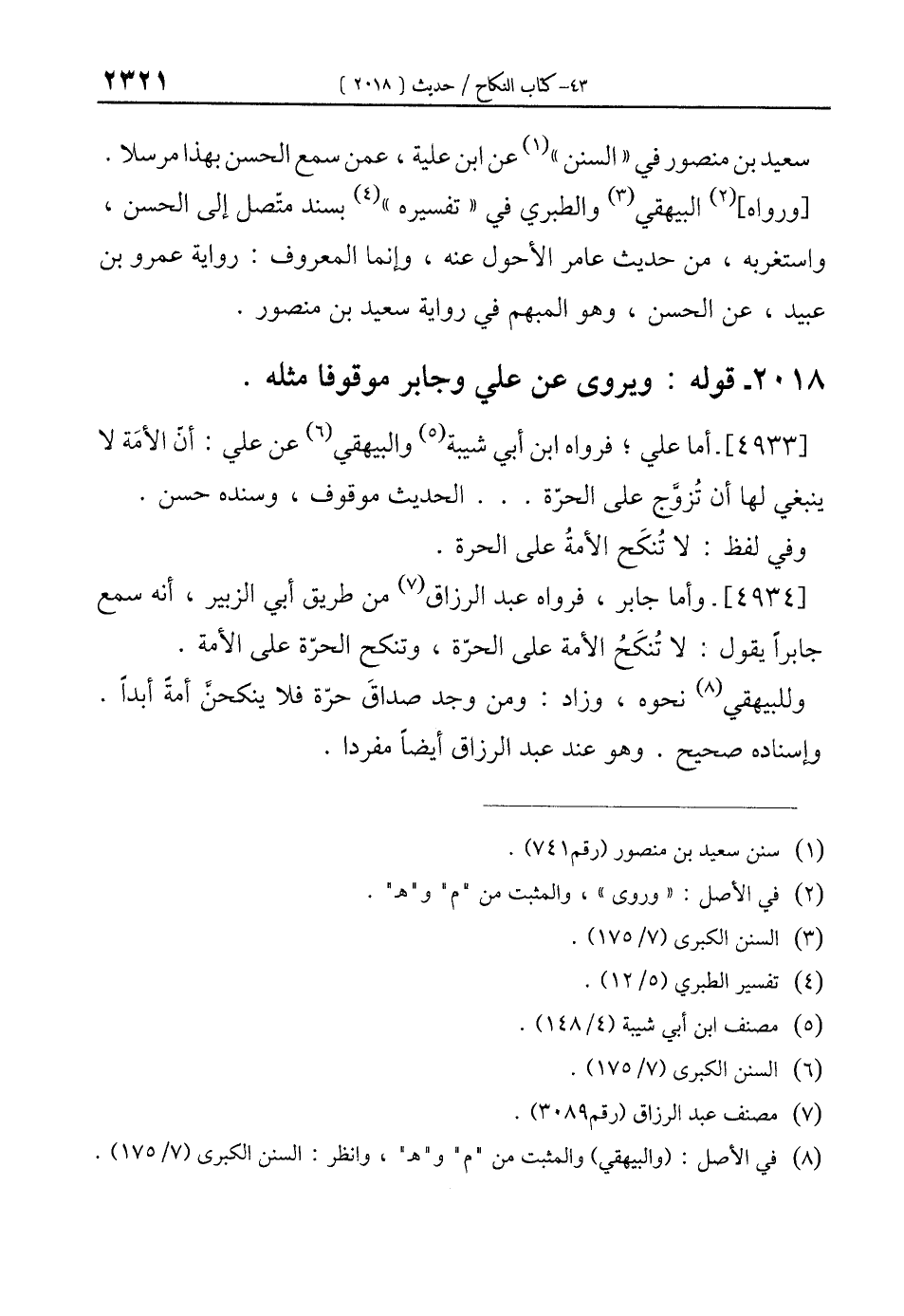 [4933]- أما علي؛ فرواه ابن أبي شيبة (¬5) والبيهقي (¬6) عن علي: أنّ الأمَة لا ينبغي لها أن تُزوَّج على الحرّة ... الحديث موقوف، وسنده حسن.