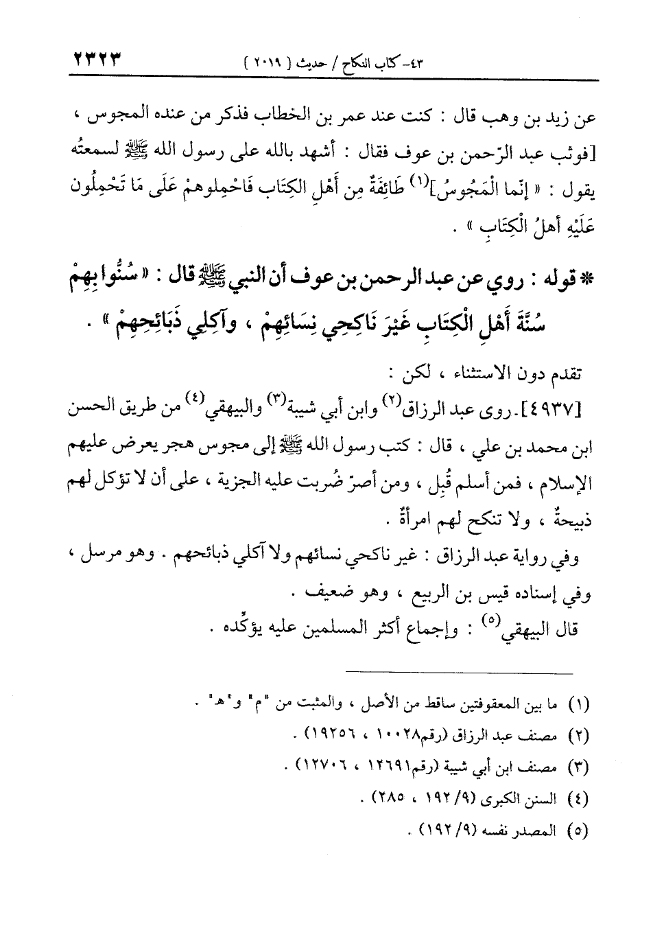 [4937]- روى عبد الرزاق (¬2) وابن أبي شيبة (¬3) والبيهقي (¬4) من طريق الحسن ابن محمَّد بن علي، قال: كتب رسول الله - صلى الله عليه وسلم - إلى مجوس هجر يعرض عليهم الإِسلام، فمن أسلم قُبِل، ومن أصرّ ضُربت عليه الجزية، على أن لا تؤكل لهم ذبيحةٌ، ولا تنكح لهم امرأةٌ.