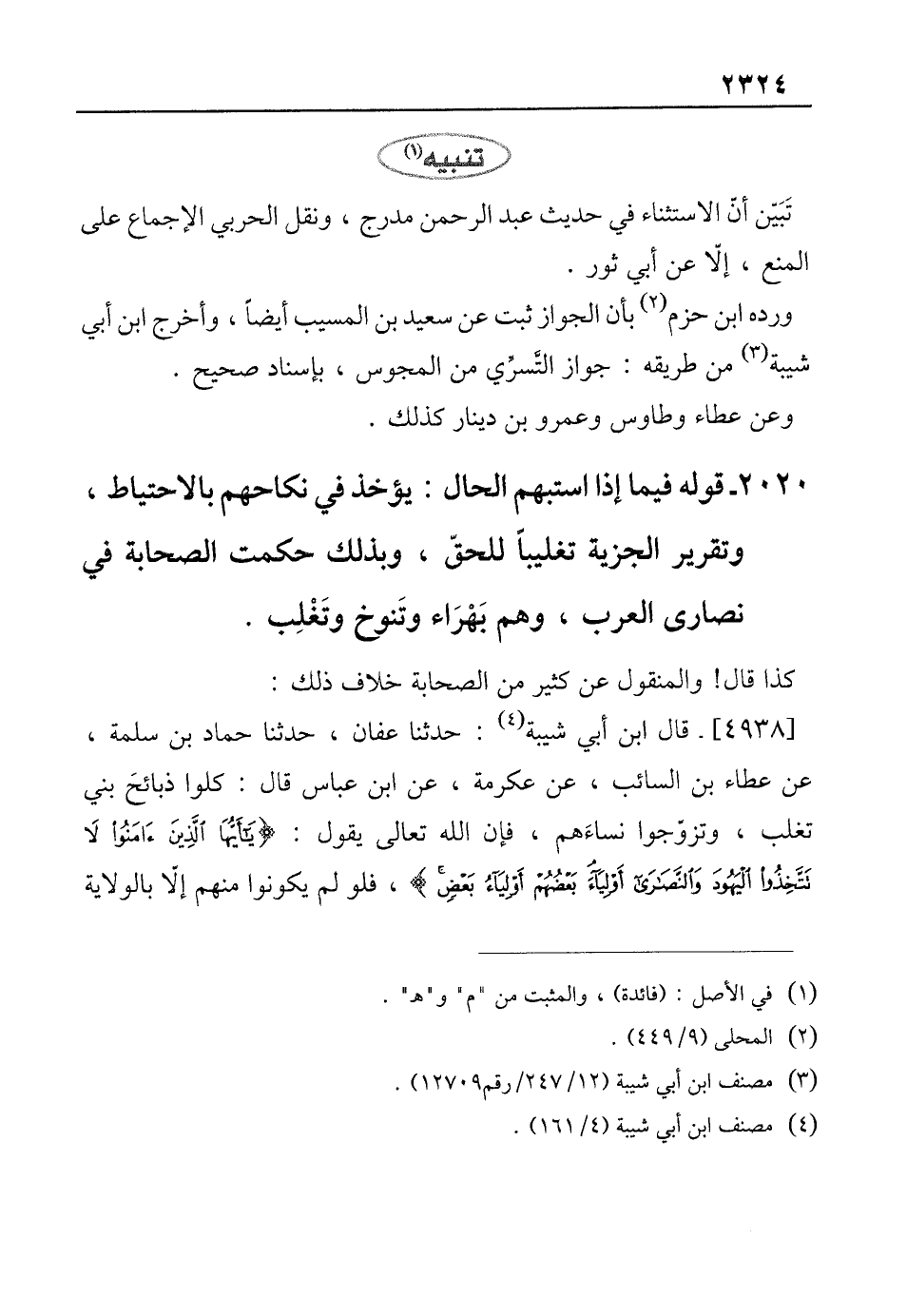 2020 - قوله فيما إذا استبهم الحال: يؤخذ في نكاحهم بالاحتياط، وتقريو الجزية تغليبًا للحقّ، وبذلك حكمت الصحابة في نصارى العرب، وهم بَهْرَاء وتَنوخ وتَغْلِب.
