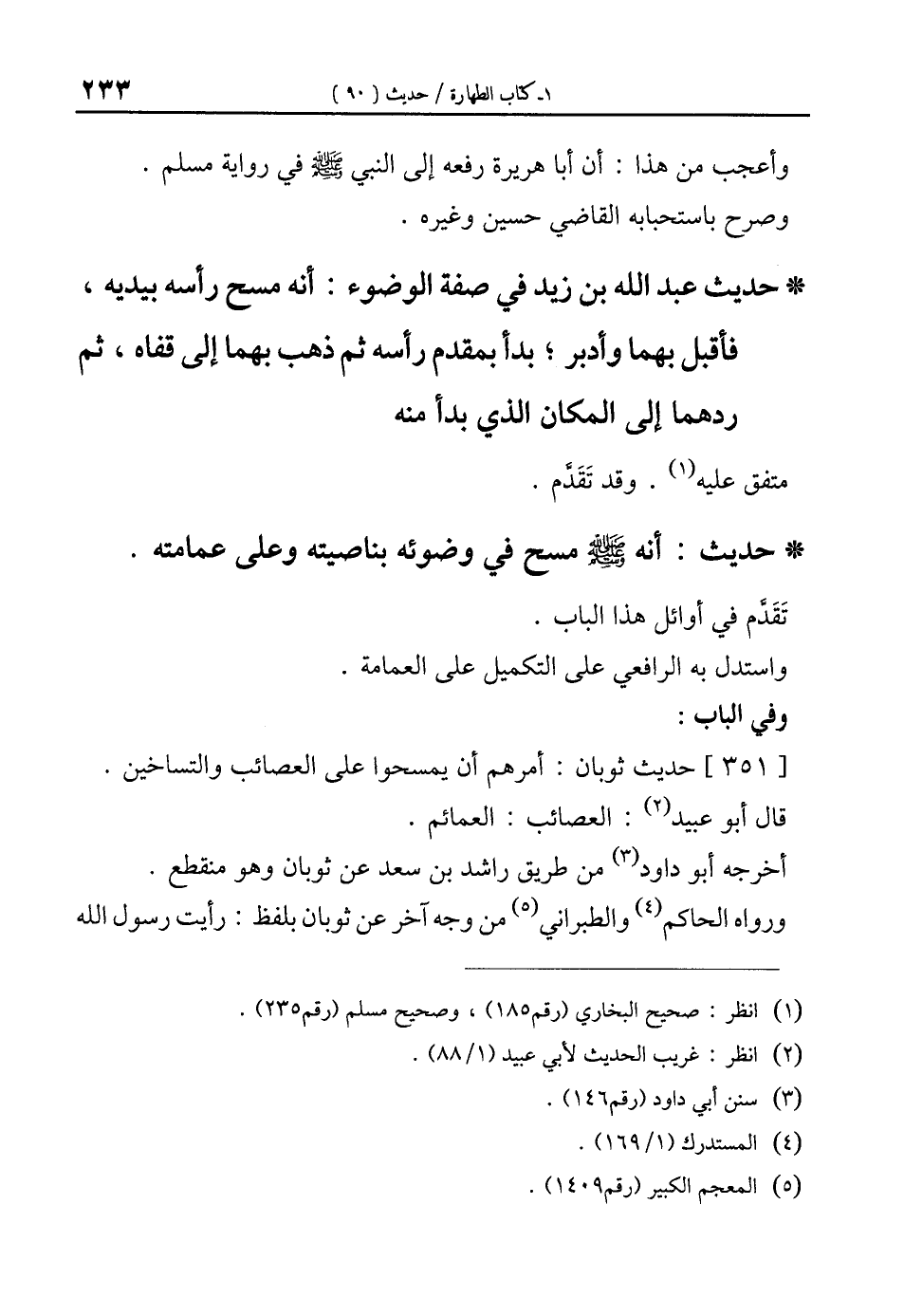* حديث: أنه - صلى الله عليه وسلم - مسح في وضوئه بناصيته وعلى عمامته.