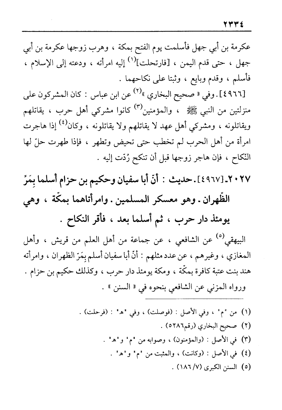 2027 - [4967]- حديث: أنّ أبا سفيان وحكيم بن حزام أسلما بِمَرِّ الظّهران -وهو معسكر المسلمين- وامرأتاهما بمكّة، وهي يومئذ دار حرب، ثم أسلما بعد، فأقر النكاح.