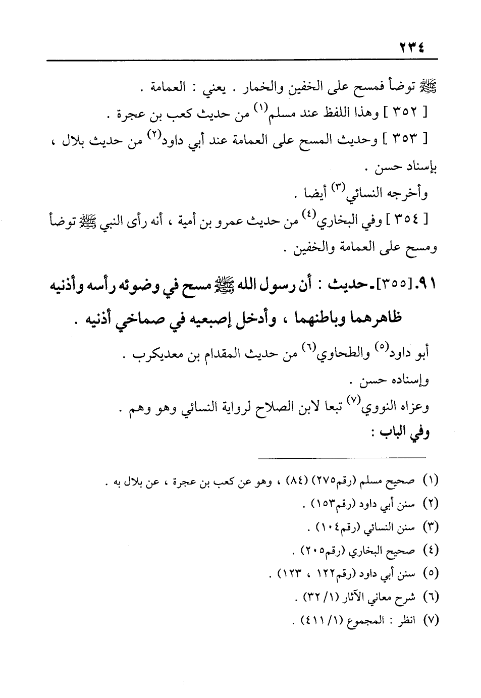 91 - [355]- حديث: أن رسول الله - صلى الله عليه وسلم - مسح في وضوئه رأسه وأذنيه ظاهرهما وباطنهما، وأدخل إصبعيه في صماخي أذنيه.