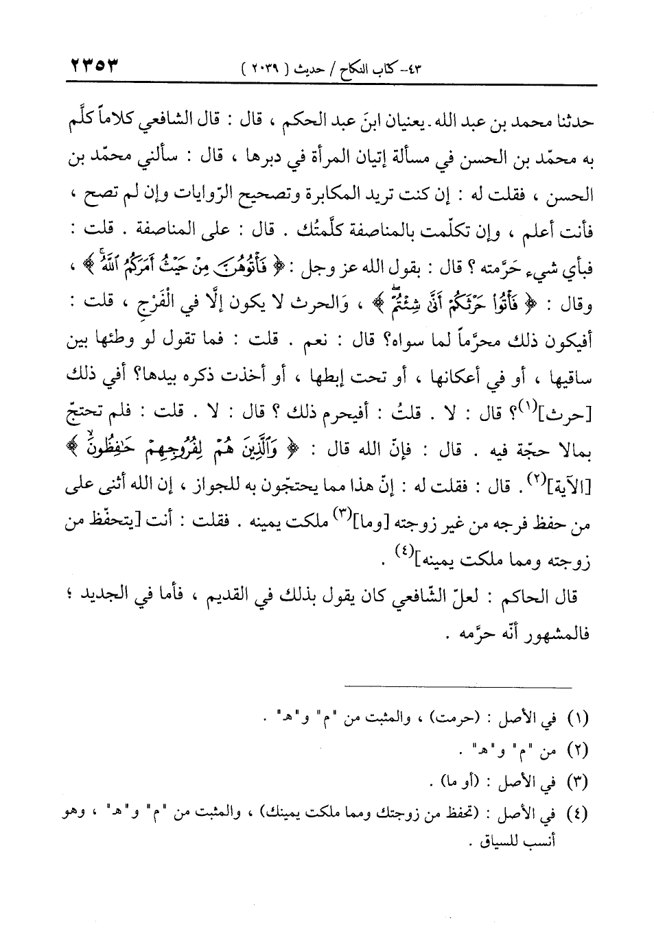 حدثنا محمَّد بن عبد الله -يعنيان ابنَ عبد الحكم، قال: قال الشافعي كلامًا كلَّم به محمّد بن الحسن في مسألة إتيان المرأة في دبرها، قال: سألني محمّد بن الحسن، فقلت له: إن كنت تريد المكابرة وتصحيح الرّوايات وإن لم تصح، فأنت أعلم، وإن تكلّمت بالمناصفة كلَّمتُك. قال: على المناصفة. قلت: فبأي شيء حَرَّمته؟ قال: بقول الله عَزَّ وَجَل: {فَأْتُوهُنَّ مِنْ حَيْثُ أَمَرَكُمُ اللَّهُ}، وقال: {فَأْتُوا حَرْثَكُمْ أَنَّى شِئْتُمْ}، وَالحرث لا يكون إلَّا في الْفَرْجِ، قلت: أفيكون ذلك محرَّمًا لما سواه؟ قال: نعم. قلت: فما تقول لو وطئها بين ساقيها، أو في أعكانها، أو تحت إبطها، أو أخذت ذكره بيدها؟ أفي ذلك [حرث] (¬1)؟ قال: لا. قلتُ: أفيحرم ذلك؟ قال: لا. قلت: فلم تحتجّ بما لا حجّة فيه. قال: فإن الله قال: {وَالَّذِينَ هُمْ لِفُرُوجِهِمْ حَافِظُونَ} [الآية] (¬2). قال: فقلت له: إنّ هذا مما يحتجّون به للجواز، إن الله أثنى على من حفظ فرجه من غير زوجته [وما] (¬3) ملكت يمينه. فقلت: أنت [يتحفّظ من زوجته ومما ملكت يمينه] (¬4).