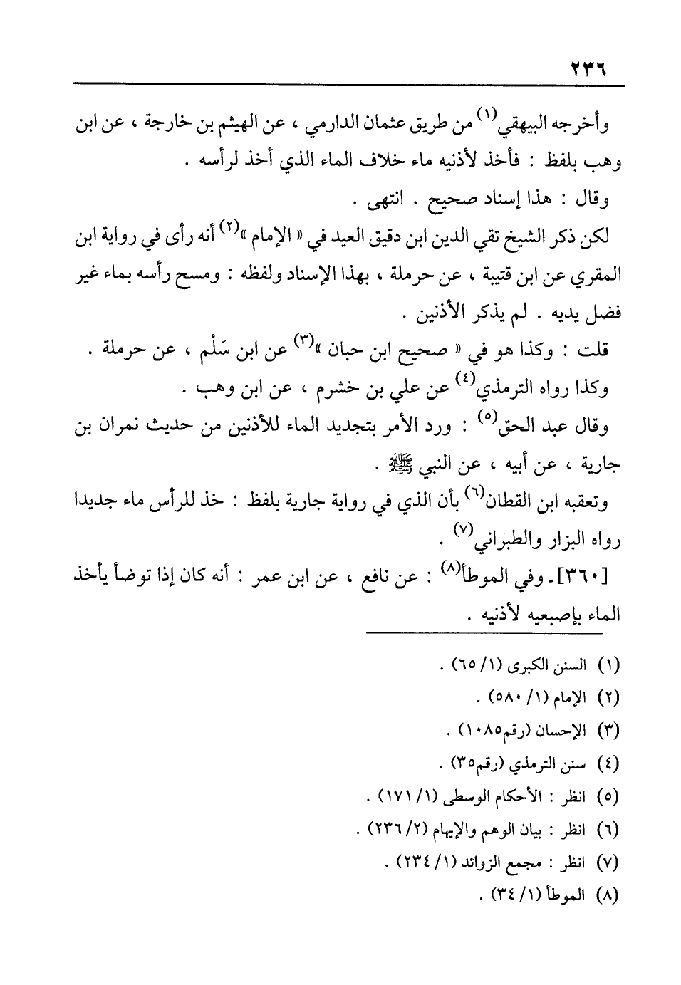[360]- وفي الموطأ (¬8): عن نافع، عن ابن عمر: أنه كان إذا توضأ يأخذ الماء بإصبعيه لأذنيه.