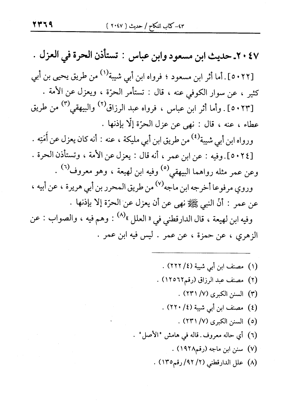 2047 - حديث ابن مسعود وابن عباس: تستأذن الحرة في العزل.