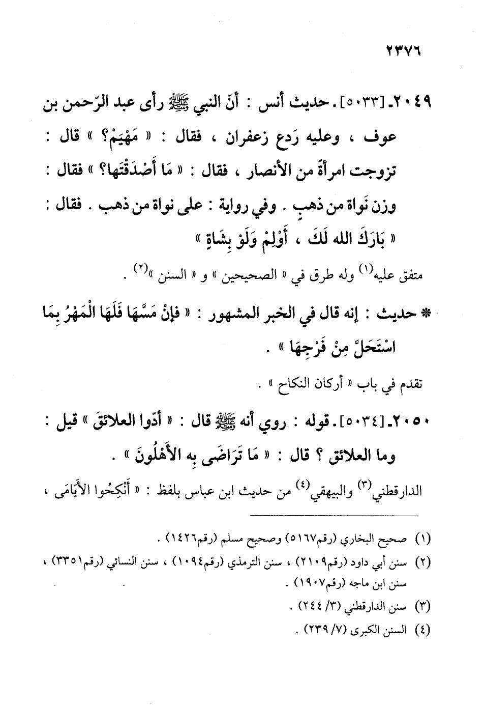 2049 - [5033]- حديث أنس: أنّ النبي - صلى الله عليه وسلم - رأى عبد الرّحمن بن عوف، وعليه رَدع زعفران، فقال: "مَهْيَمْ؟ " قال: تزوجت امرأة من الأنصار، فقال: "مَا أَصْدَقْتَها؟ " فقال: وزن نَواة من ذهب. وفي رواية: على نواة من ذهب. فقال: "بَارَكَ الله لَكَ، أَوْلمْ وَلَوْ بِشَاةٍ".