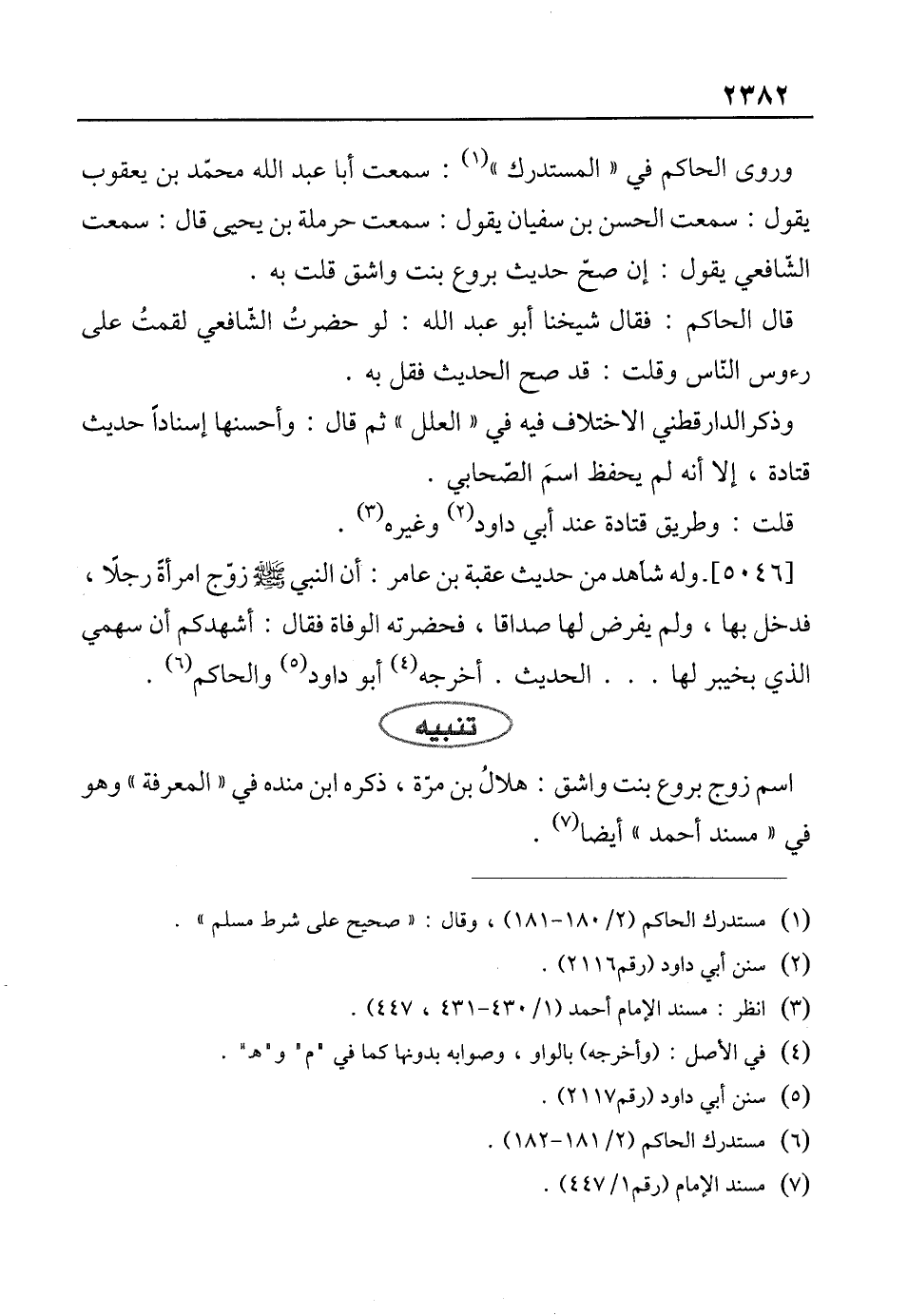 اسم زوج بروع بنت واشق: هلالُ بن مرّة، ذكره ابن منده في "المعرفة" وهو في "مسند أحمد" أيضا (¬7).
