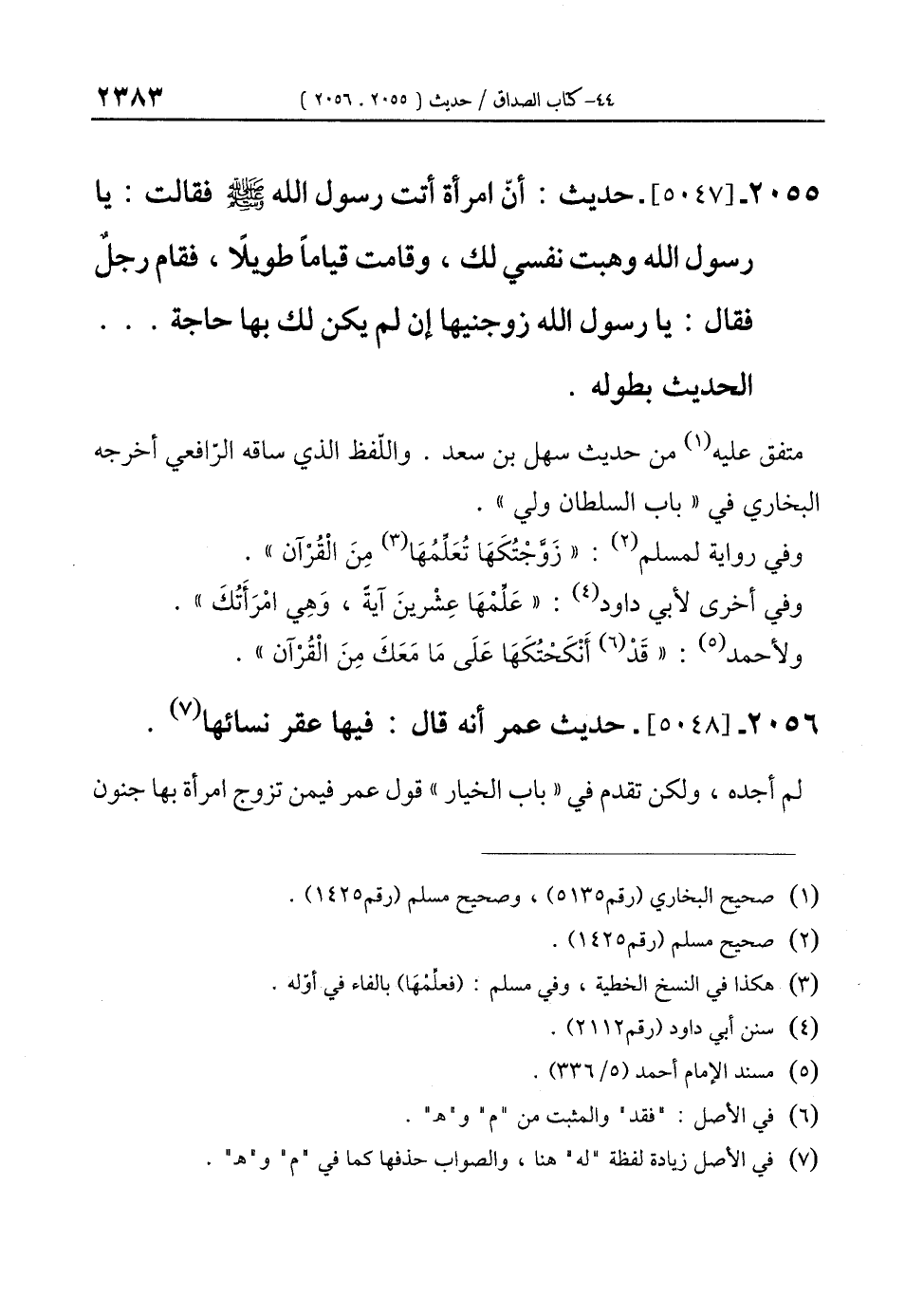 2055 - [5047]- حديث: أنّ امرأة أتت رسول الله - صلى الله عليه وسلم - فقالت: يا رسول الله وهبت نفسي لك، وقامت قيامًا طويلًا، فقام رجلٌ فقال: يا رسول الله زوجنيها إن لم يكن لك بها حاجة ... الحديث بطوله.