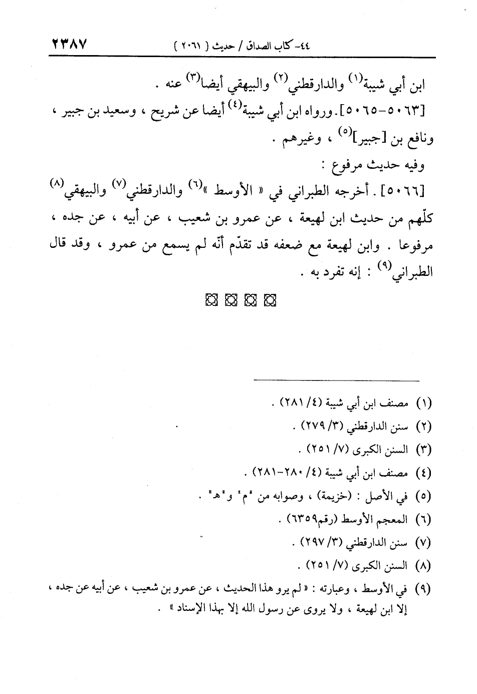 (¬9) في الأوسط، وعبارته: "لم يرو هذا الحديث، عن عمرو بن شعيب، عن أبيه عن جده، إلا ابن لهيعة، ولا يروى عن رسول الله إلا بهذا الإسناد".