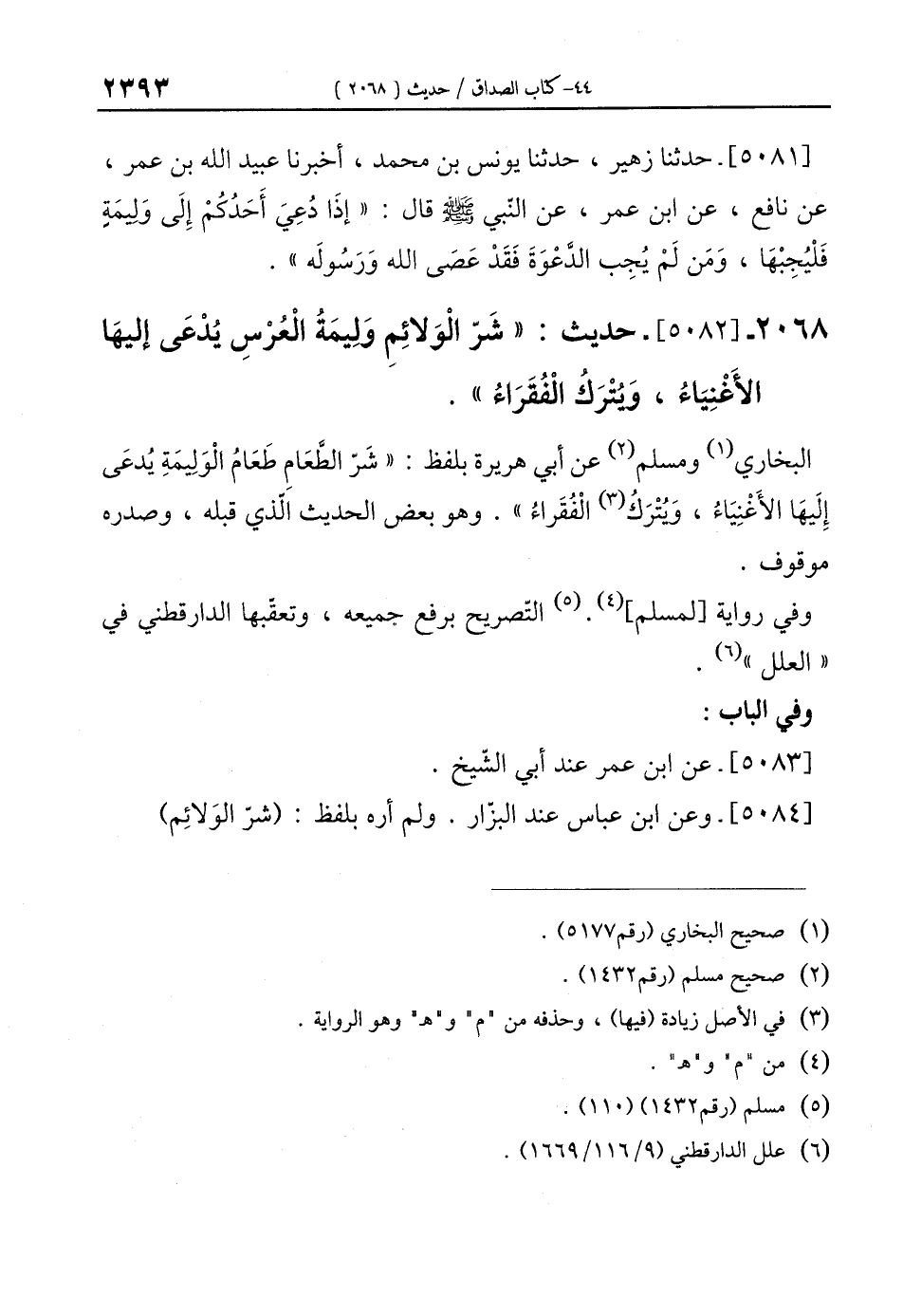 2068 - [5082]- حديث: "شَرّ الْوَلائِمِ وَلِيمَةُ الْعُرْسِ يُدْعَى إليهَا الأَغْنِيَاءُ، وَيُتْرَكُ الْفُقَرَاءُ".