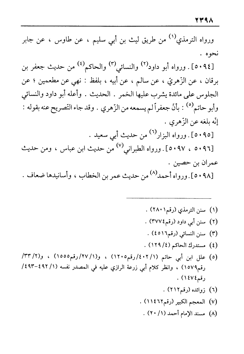 [5094]- ورواه أبو داود (¬2) والنسائي (¬3) والحاكم (¬4) من حديث جعفر بن برقان، عن الزّهريّ، عن سالم، عن أبيه، بلفظ: نهي عن مطعمين؛ عن الجلوس على مائدة يشرب عليها الخمر. الحديث. وأعله أبو داود والنسائي وأبو حاتم (¬5): بأنّ جعفرًا لم يسمعه من الزّهري. وقد جاء التّصريح عنه بقوله: إنّه بلغه عن الزّهري.