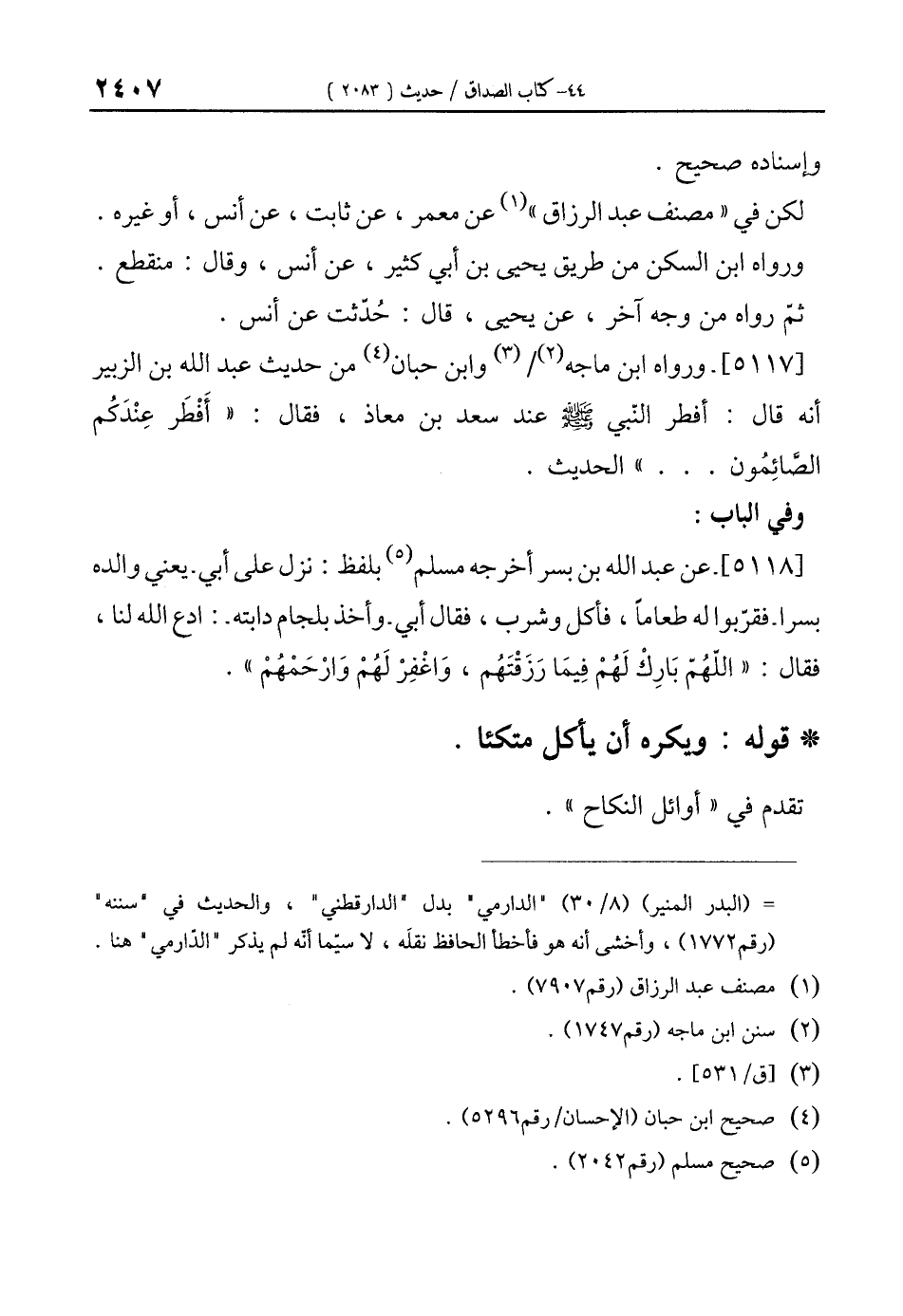 [5117]- ورواه ابن ماجه (¬2) (¬3) وابن حبان (¬4) من حديث عبد الله بن الزبير أنه قال: أفطر النبي - صلى الله عليه وسلم - عند سعد بن معاذ، فقال: "أَفْطَر عِنْدَكُم الصَّائِمُون ... " الحديث.