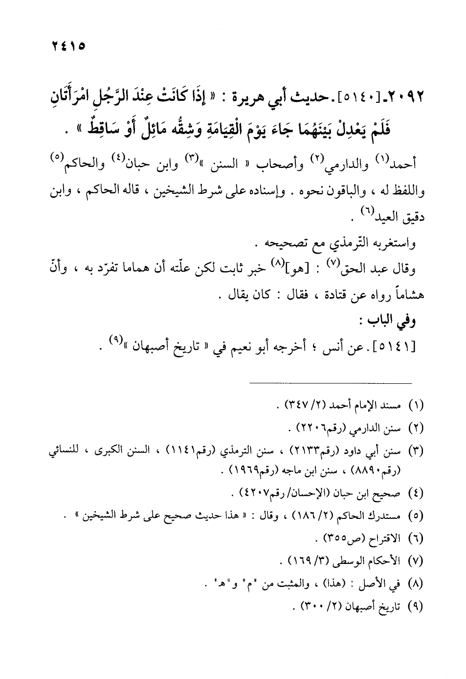 2092 - [5140]- حديث أبي هريرة: "إذا كانَتْ عِنْدَ الرَّجُلِ امْرَأَتَانِ فَلَمْ يَعْدِلْ بَينَهُمَا جَاءَ يَومَ الْقِيَامَةِ وَشِقُّه مَائِلٌ أَوْ سَاقِطٌ".