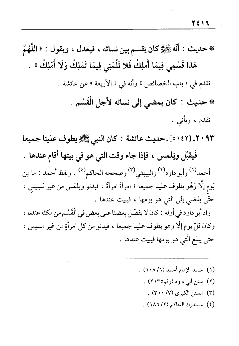 أحمد (¬1) وأبو داود (¬2) والبيهقي (¬3) وصححه الحاكم (¬4). ولفظ أحمد: ما مِن يَومٍ إلَّا وَهُو يطوف علينا جميعًا؛ امرأةً امرأةً، فيدنو ويلمَس من غير مَسِيسٍ، حتّى يفضي إلى التي هو يومها، فيبيت عندها.