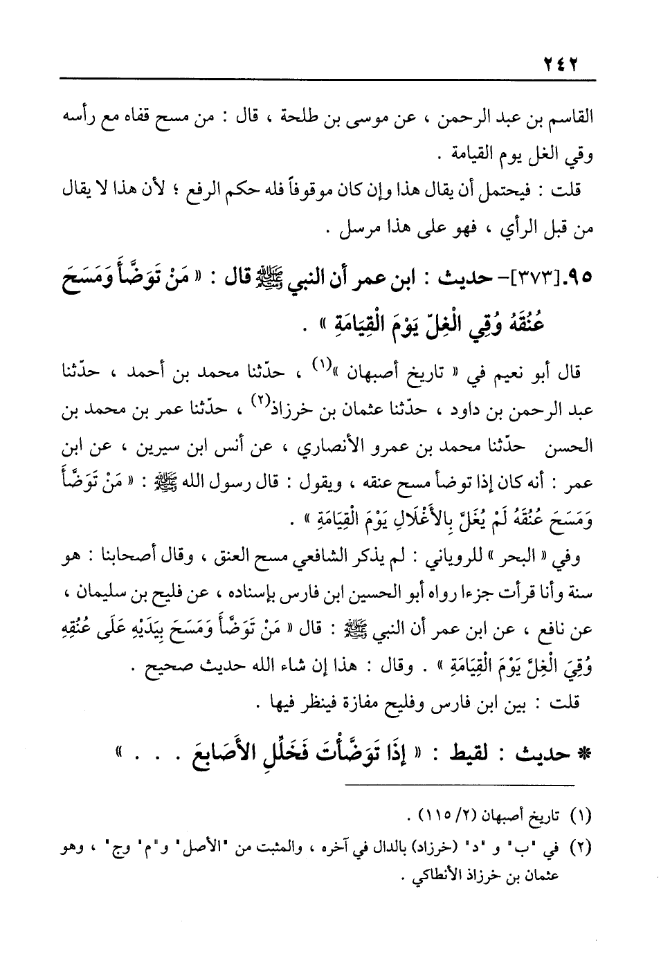 95 - [373]- حديث: ابن عمر أن النبي - صلى الله عليه وسلم - قال: "مَنْ تَوَضَّأَ وَمَسَحَ عُنُقَهُ وُقِي الْغِلّ يَوْمَ الْقِيَامَةِ".
