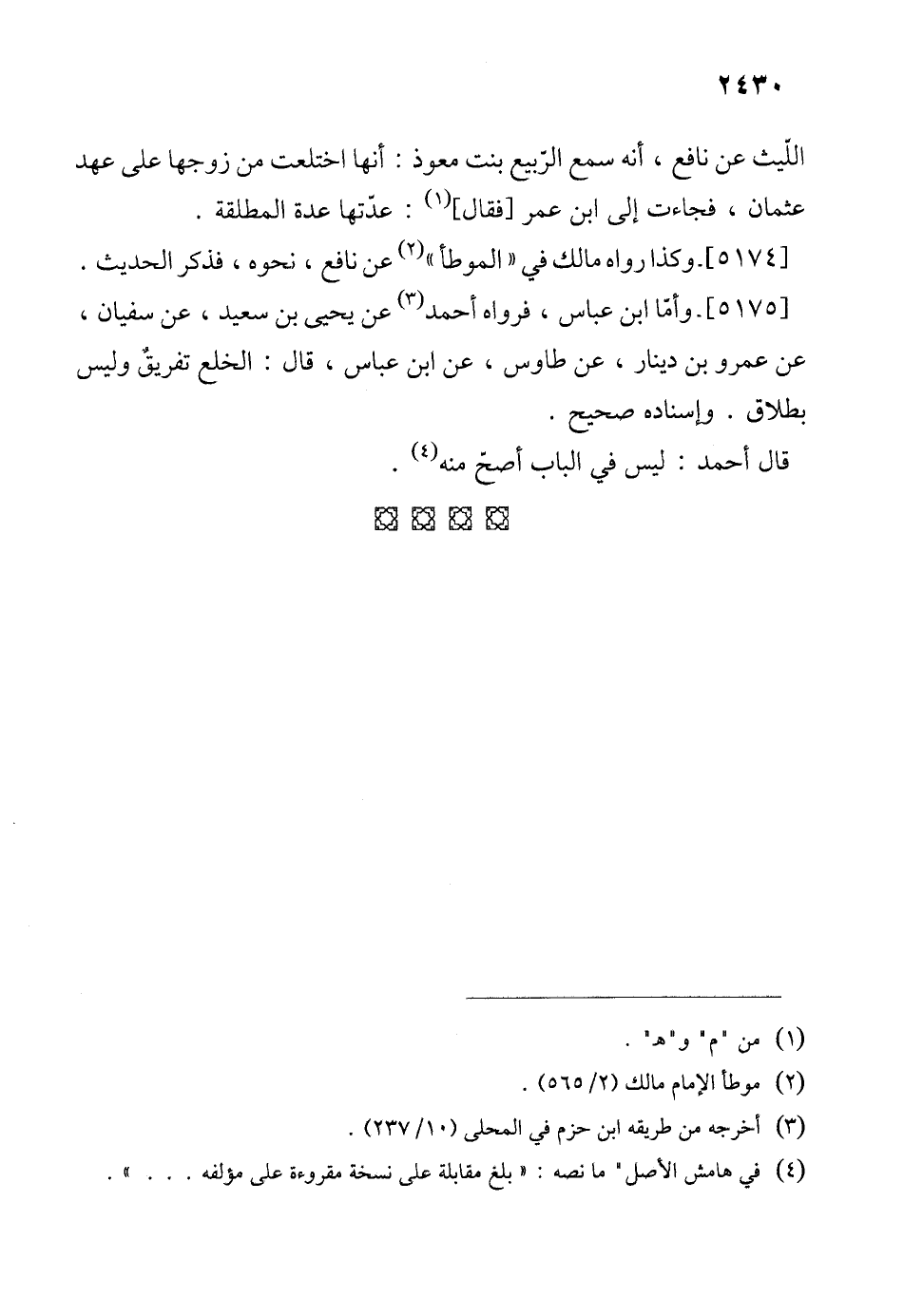 [5175]- وأمّا ابن عباس، فرواه أحمد (¬3) عن يحيى بن سعيد، عن سفيان، عن عمرو بن دينار، عن طاوس، عن ابن عباس، قال: الخلع تفريقٌ وليس بطلاق. وإسناده صحيح.