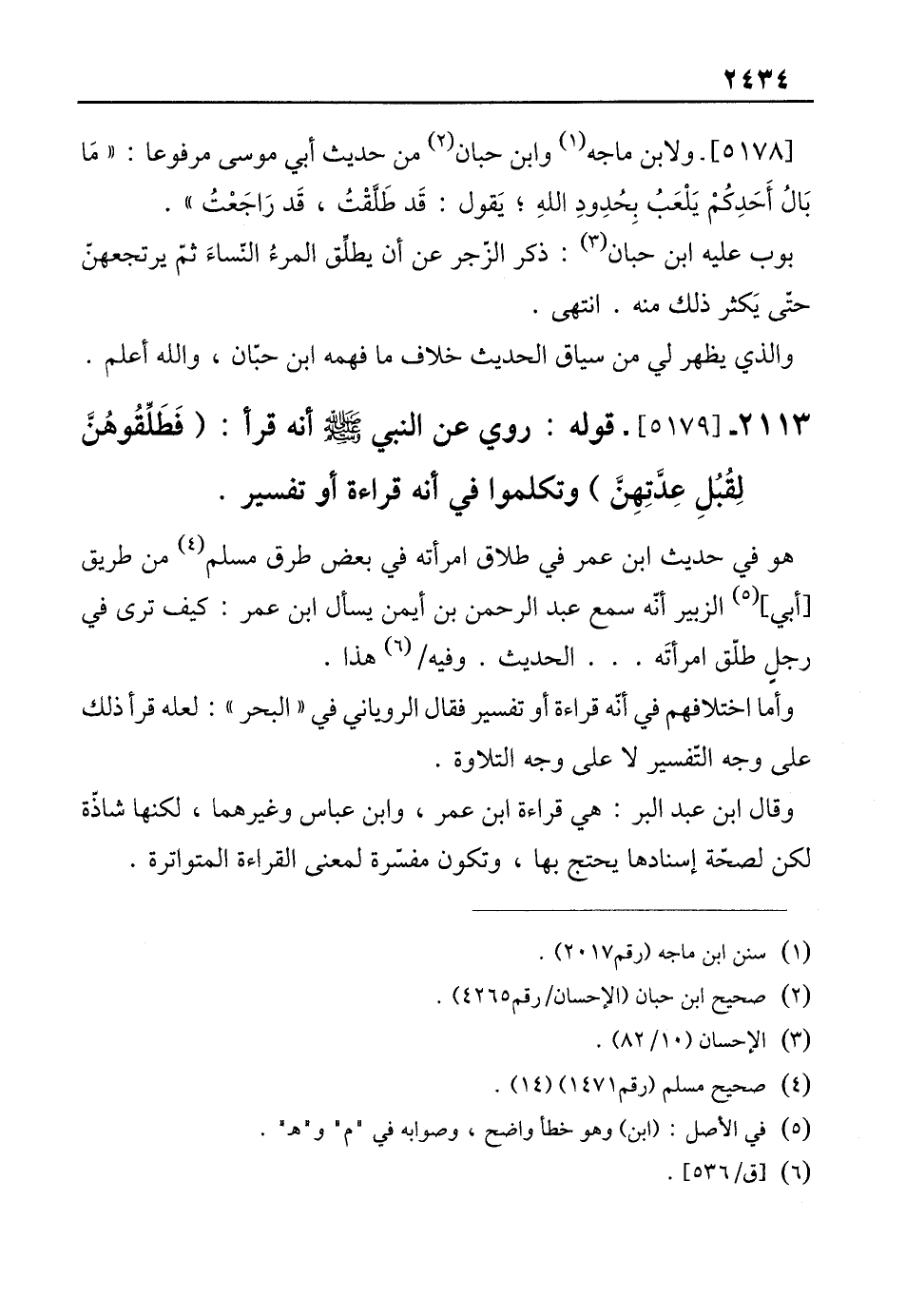 2113 - [5179]- قوله: روي عن النبي - صلى الله عليه وسلم - أنه قرأ: (فَطَلِّقُوهُنَّ لِقُبُلِ عِدَّتِهِنَّ) وتكلموا في أنه قراءة أو تفسير.