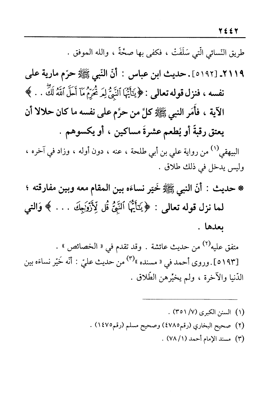 2119 - [5192]- حديث ابن عباس: أنّ النّبي - صلى الله عليه وسلم - حرّم مارية على نفسه، فنزل قوله تعالى: {يَا أَيُّهَا النَّبِيُّ لِمَ تُحَرِّمُ مَا أَحَلَّ اللَّهُ لَكَ} الآية، فأَمَر النبي - صلى الله عليه وسلم - كلَّ من حرَّم على نفسه ما كان حلالا أن يعتق رقبةً أو يُطعم عشرةَ مساكين، أو يكسوهم.
