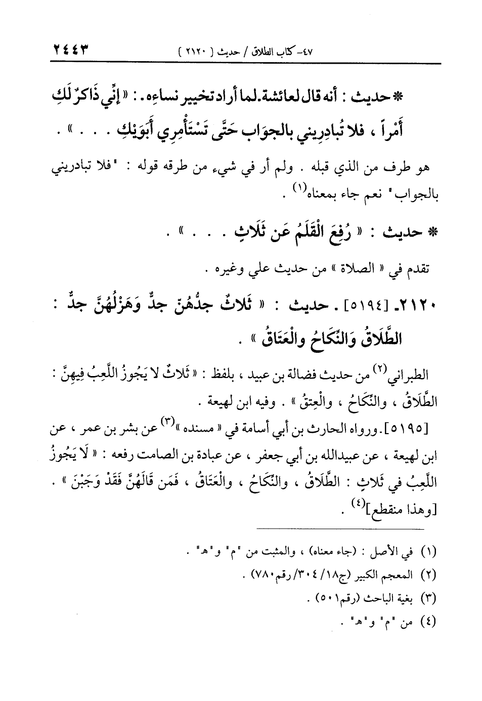 2120 - [5194]- حديث: "ثَلاثٌ جدُّهنّ جدٌّ وَهَزْلُهنَّ جدٌّ: الطَّلَاقُ وَالنِّكَاحُ والْعَتَاقُ".