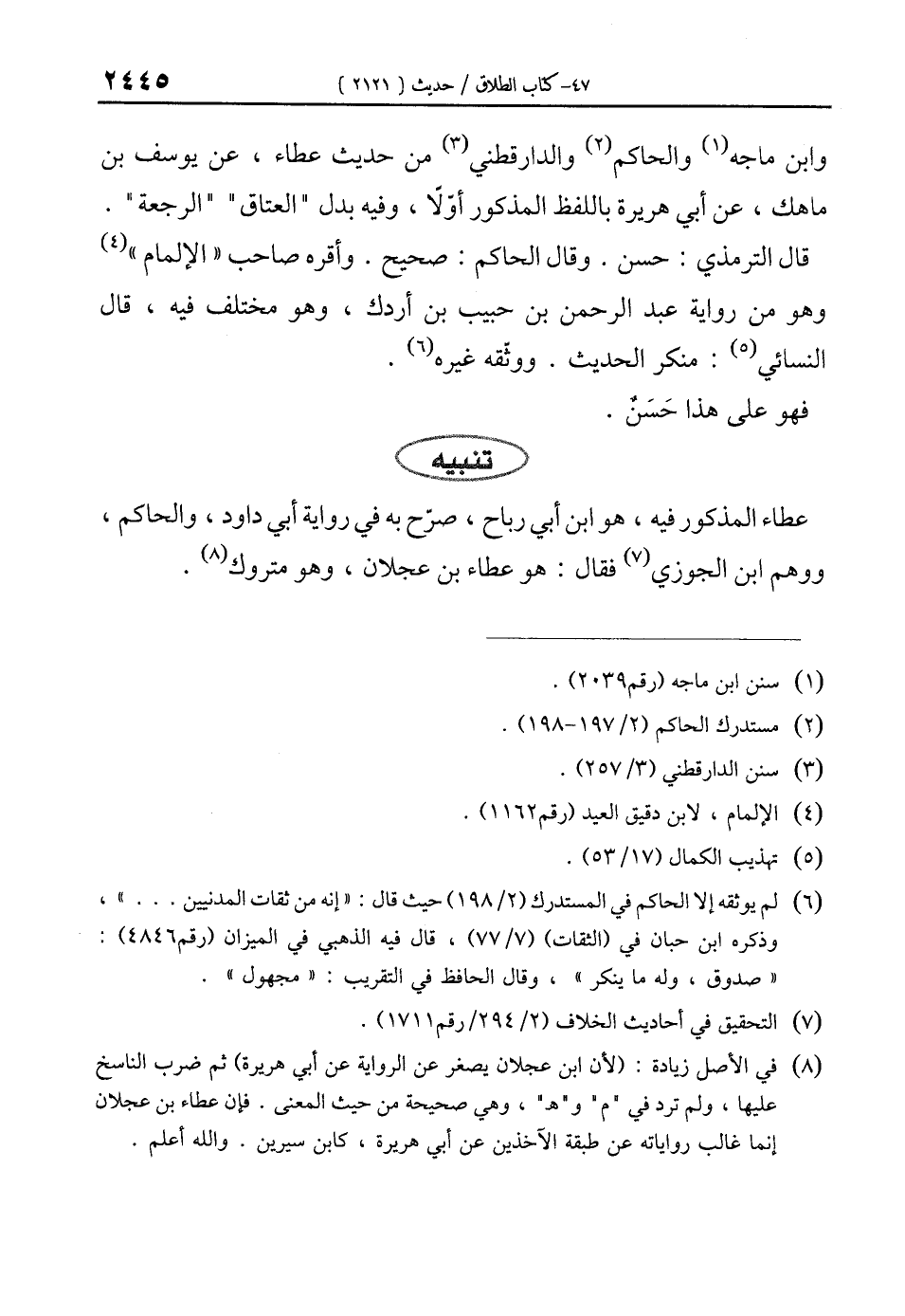 (¬8) في الأصل زيادة: (لأن ابن عجلان يصغر عن الرواية عن أبي هريرة) ثم ضرب الناسخ عليها, ولم ترد في "م" و "هـ"، وهي صحيحة من حيث المعنى. فإن عطاء بن عجلان إنما غالب رواياته عن طبقة الآخذين عن أبي هريرة، كابن سيرين. والله أعلم.