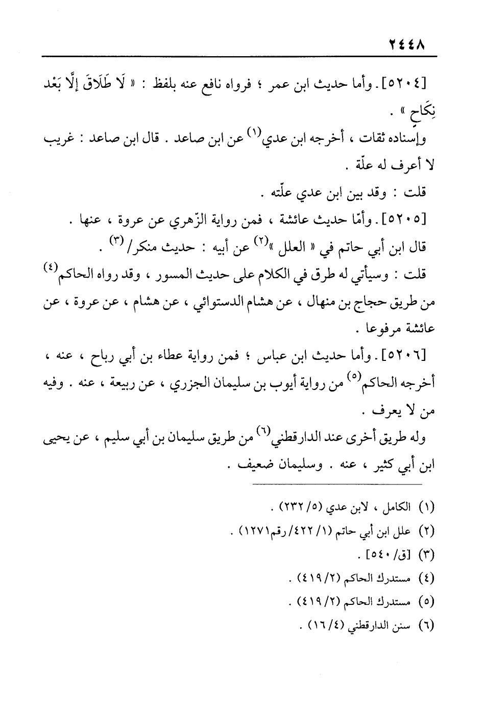 [5204]- وأما حديث ابن عمر؛ فرواه نافع عنه بلفظ: "لاَ طَلَاقَ إلَّا بَعْد نِكَاحٍ".