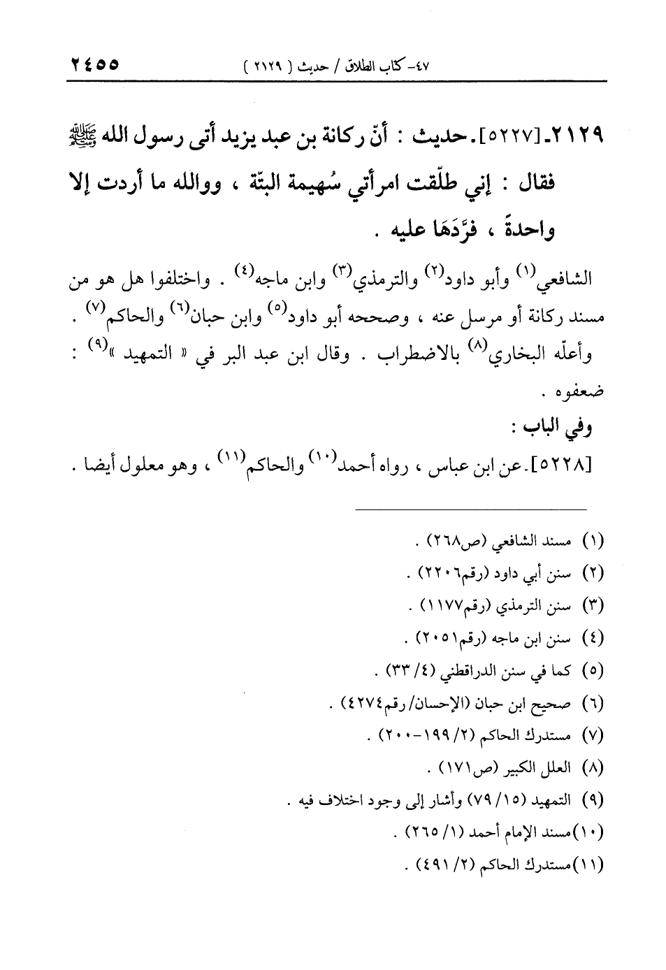 2129 - [5227]- حديث: أنّ ركانة بن عبد يزيد أتى رسول الله - صلى الله عليه وسلم - فقال: إني طلّقت امرأتي سُهيمة البتّة، ووالله ما أردت إلا واحدةً، فرَّدَهَا عليه.
