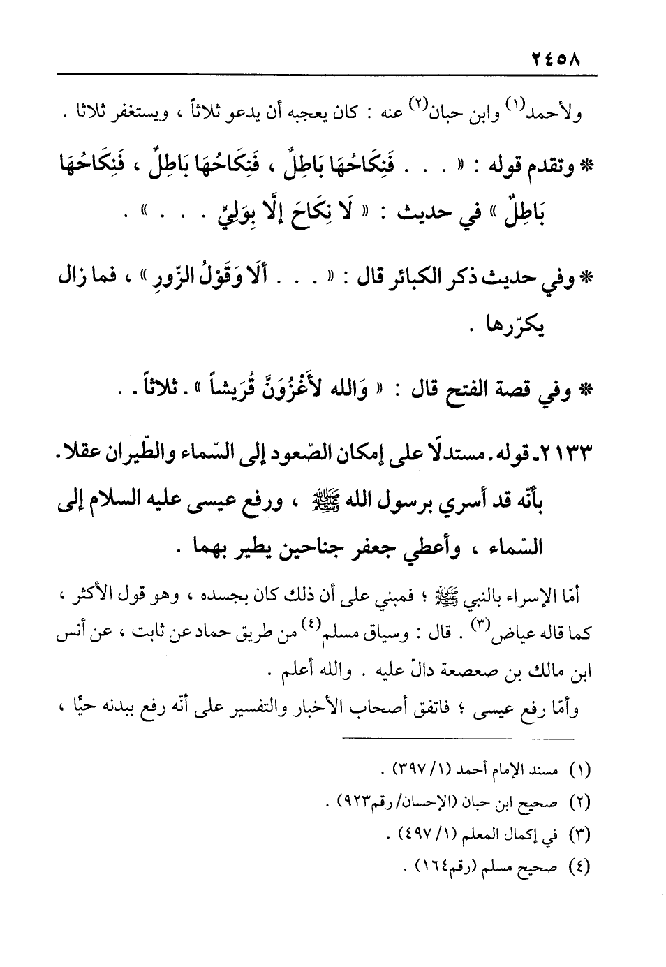2133 - قوله -مستدلًا على إمكان الصّعود إلى السّماء والطّيران عقلا- بأنّه قد أسري برسول الله - صلى الله عليه وسلم -، ورفع عيسى عليه السلام إلى السّماء، وأعطي جعفر جناحين يطير بهما.