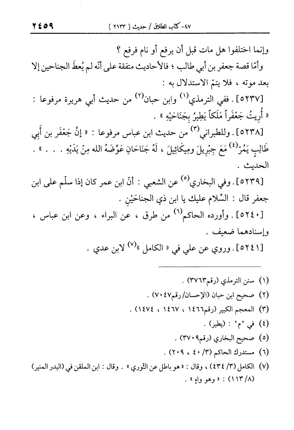[5237]- ففي الترمذي (¬1) وابن حبان (¬2) من حديث أبي هريرة مرفوعا: "أُرِيتُ جَعْفَرًا مَلَكًا يَطِيرُ بِجَنَاحَيْهِ".