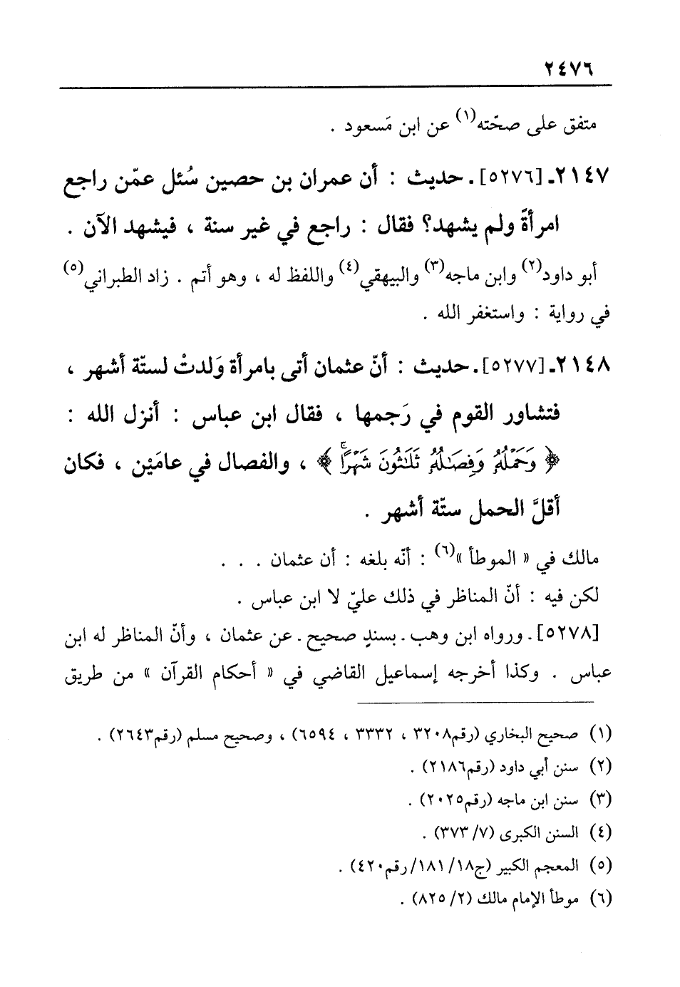 2148 - [5277]- حديث: أنّ عثمان أتى بامرأة وَلدتْ لستّة أشهر، فتشاور القوم في رَجمها، فقال ابن عباس: أنزل الله: {وَحَمْلُهُ وَفِصَالُهُ ثَلَاثُونَ شَهْرًا}، والفصال في عامَيْن، فكان أقلَّ الحمل ستّة أشهر.