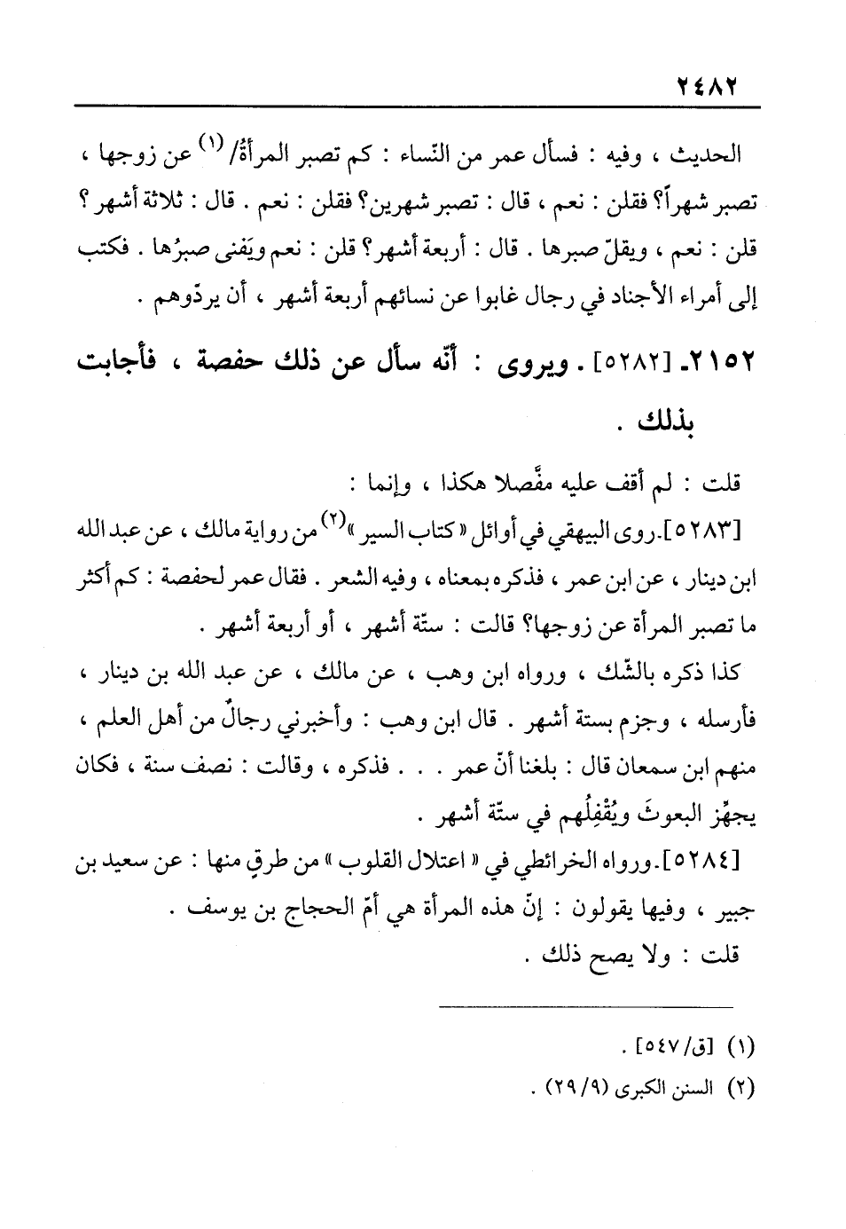 [5283]- روى البيهقي في أوائل "كتاب السير" (¬2) من رواية مالك، عن عبد الله ابن دينار، عن ابن عمر، فذكره بمعناه، وفيه الشعر. فقال عمر لحفصة: كم أكثر ما تصبر المرأة عن زوجها؟ قالت: ستّة أشهر، أو أربعة أشهر.