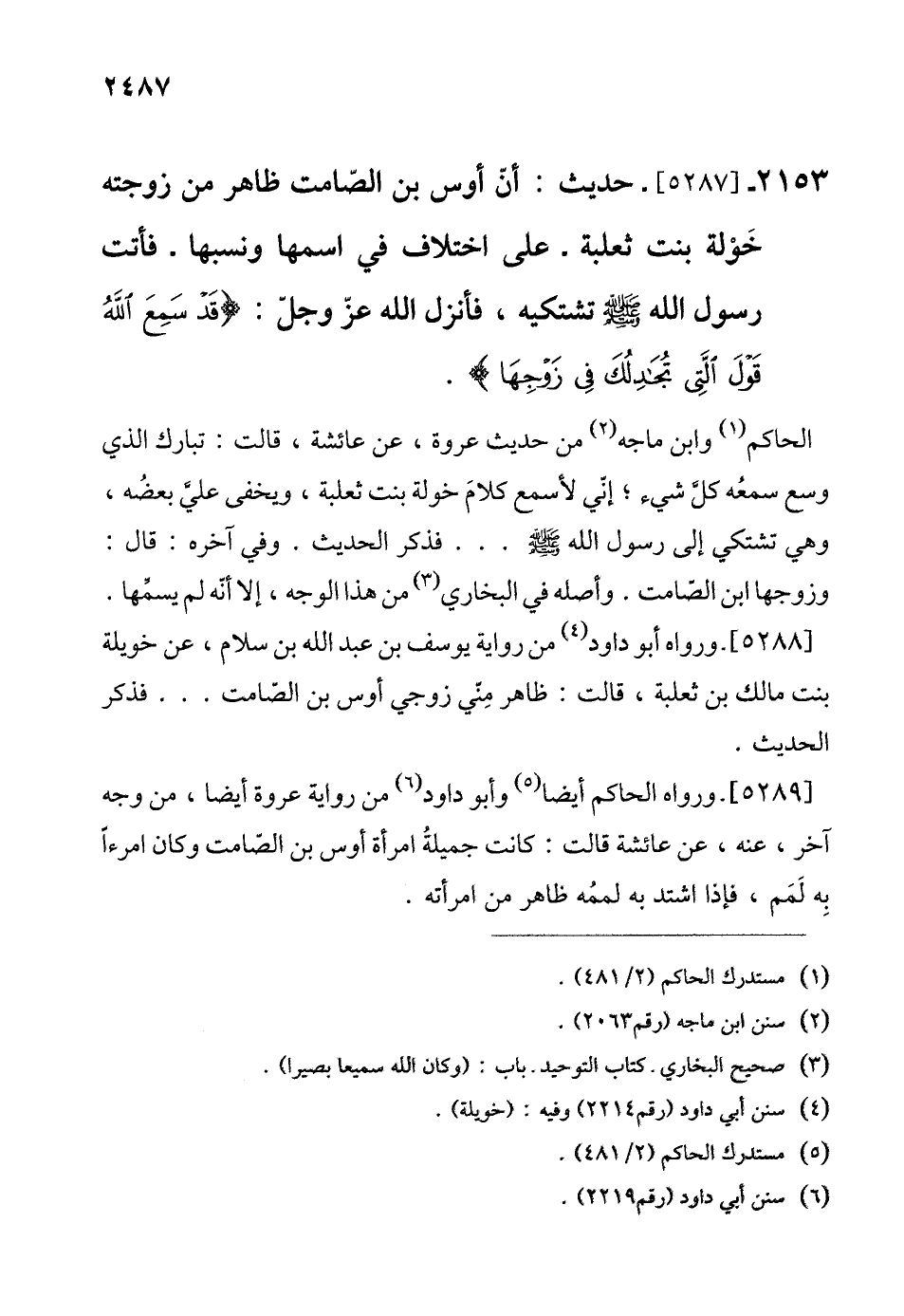 2153 - [5287]- حديث: أنّ أوس بن الصّامت ظاهر من زوجته خَوْلة بنت ثعلبة -على اختلاف في اسمها ونسبها- فأتت رسول الله - صلى الله عليه وسلم - تشتكيه، فأنزل الله عَزَّ وَجَلَّ: {قَدْ سَمِعَ اللَّهُ قَوْلَ الَّتِي تُجَادِلُكَ فِي زَوْجِهَا}.