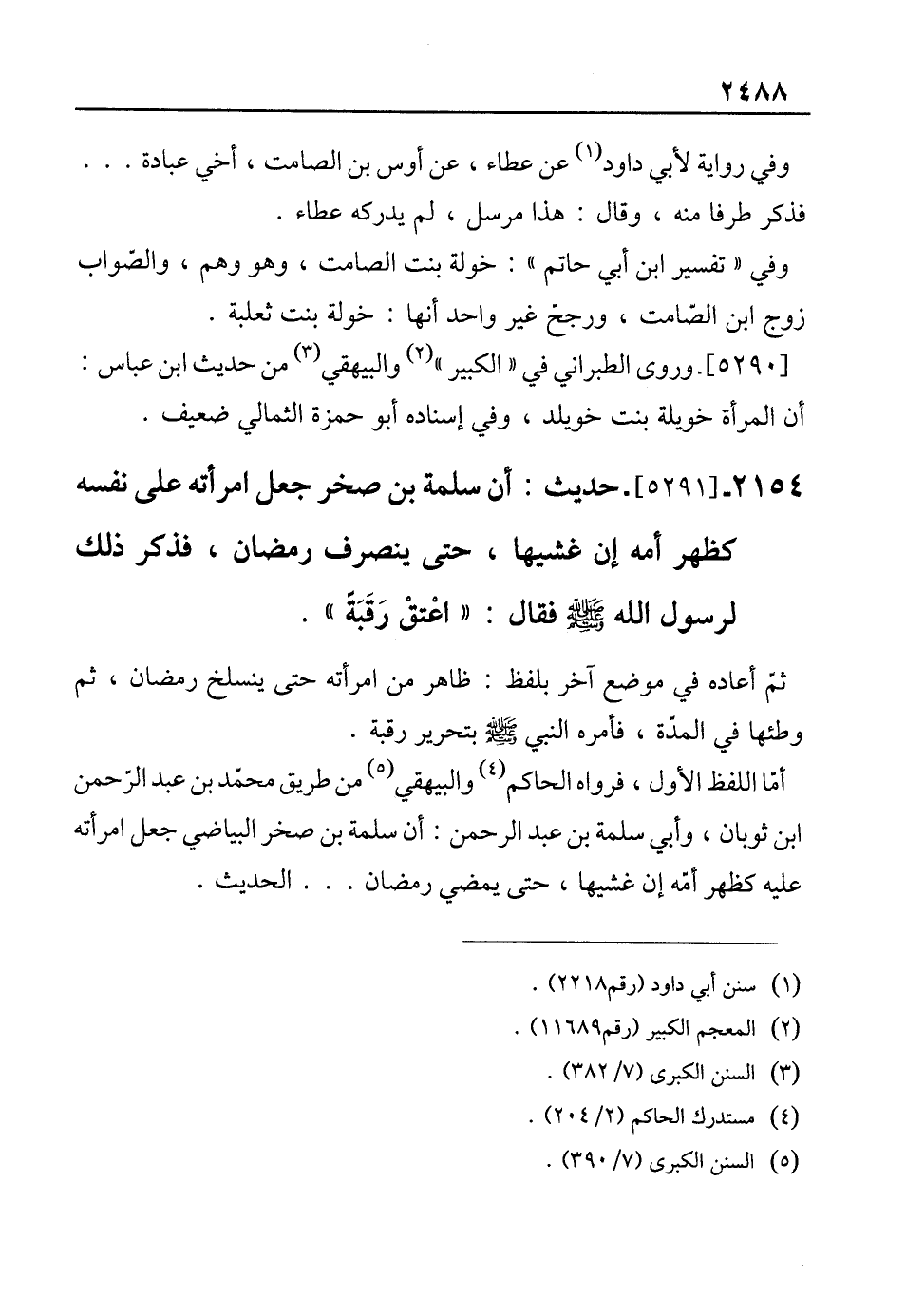 2154 - [5291]- حديث: أن سلمة بن صخر جعل امرأته على نفسه كظهر أمه إن غشيها، حتى ينصرف رمضان، فذكر ذلك لرسول الله - صلى الله عليه وسلم - فقال: "اعْتقْ رَقَبَةً".