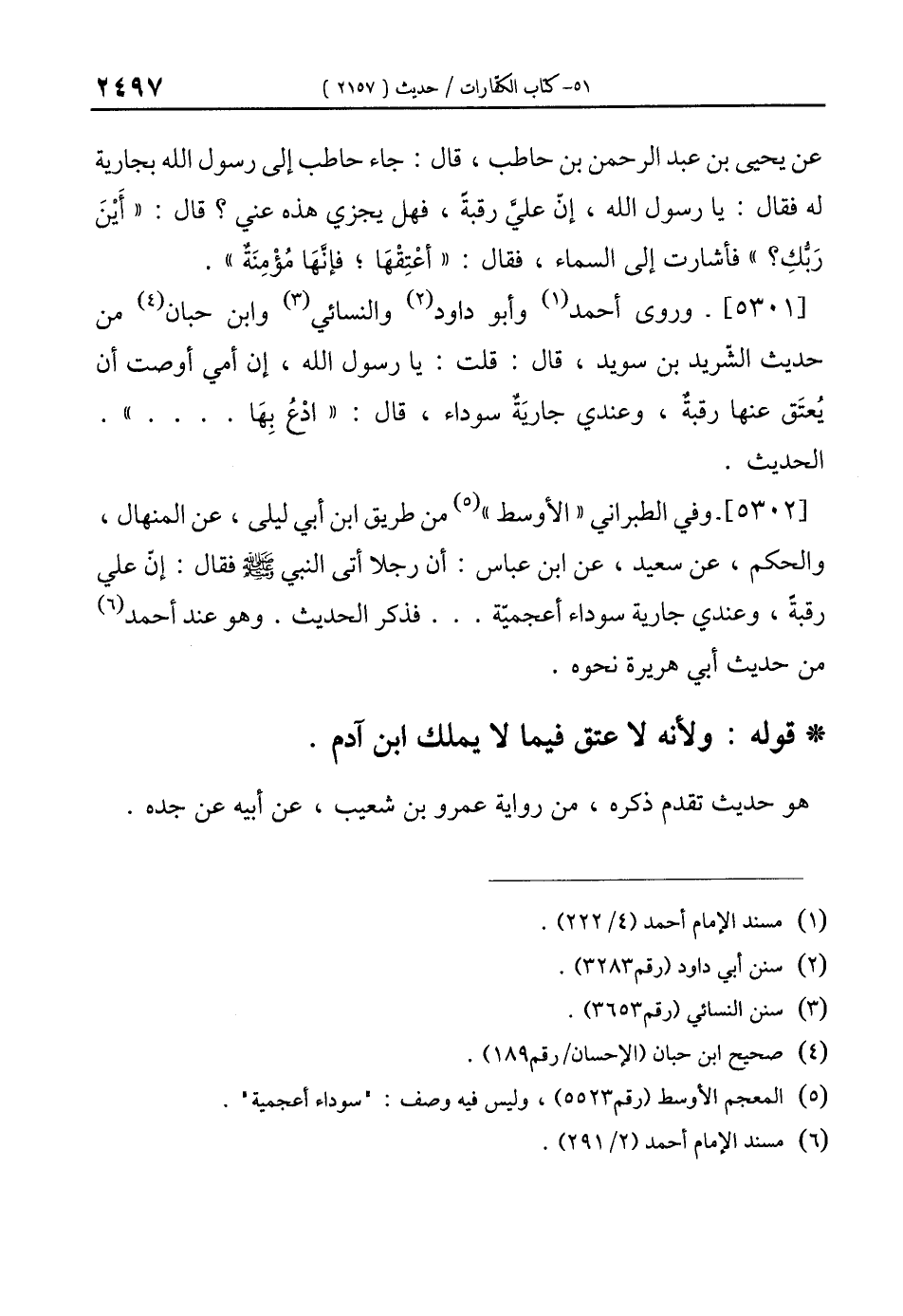 عن يحيى بن عبد الرحمن بن حاطب، قال: جاء حاطب إلى رسول الله بجارية له فقال: يا رسول الله، إنّ عليَّ رقبةً، فهل يجزي هذه عني؟ قال: "أَيْنَ رَبُّكِ؟ " فأشارت إلى السماء، فقال: "أعْتِقْهَا؛ فإنَّهَا مُؤْمِنَةٌ".