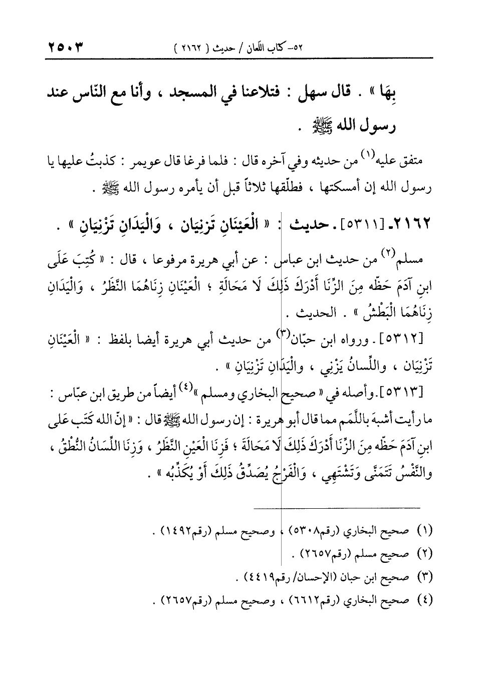 2162 - [5311]- حديث: "الْعَينَانِ تَزنِيَان، وَالْيَدَانِ تَزْنِيَانِ".