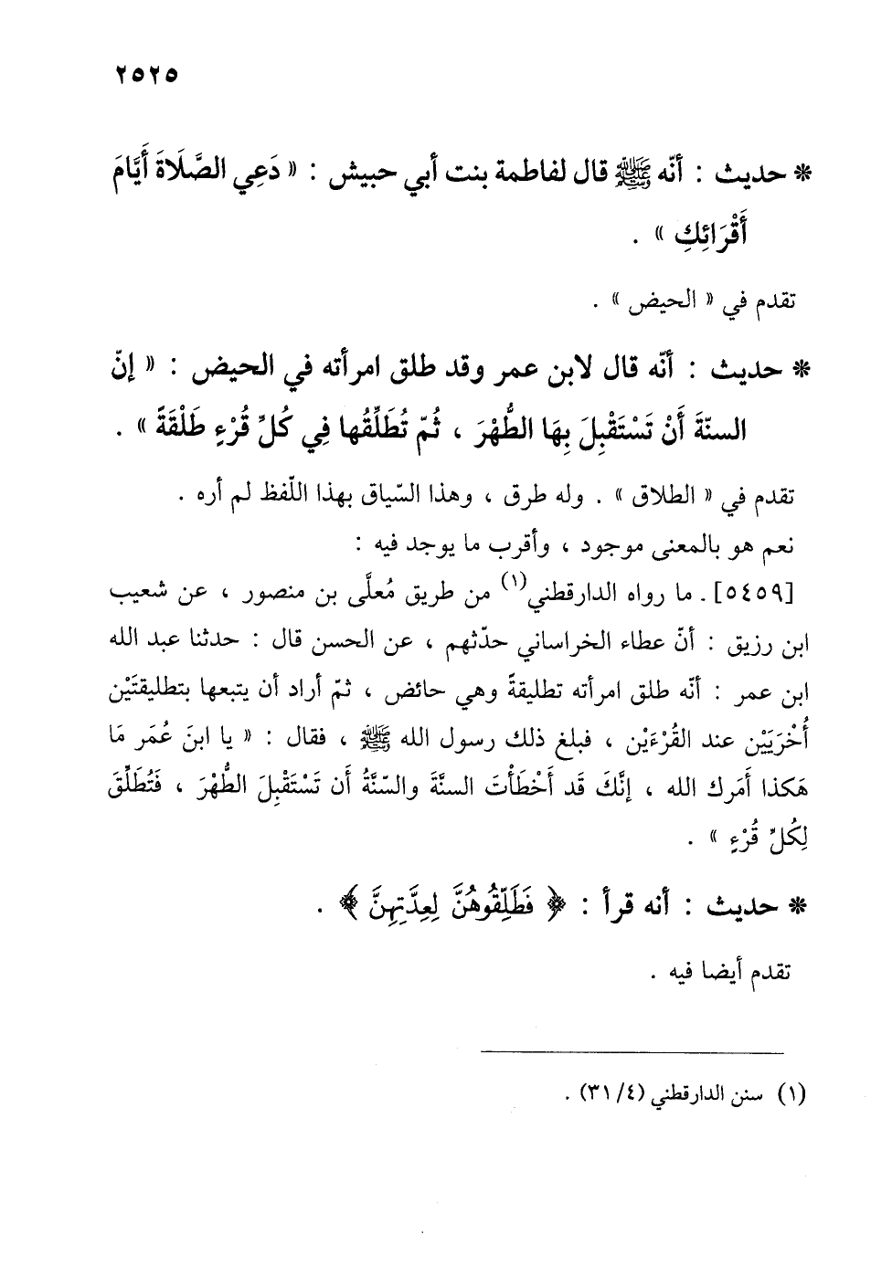 * حديث: أنّه قال لابن عمر وقد طلق امرأته في الحيض: "إنّ السنّةَ أَنْ تَسْتَقْبِلَ بِهَا الطُّهْرَ، ثمّ تُطَلِّقُها في كُلِّ قُرْءٍ طَلْقَةً".
