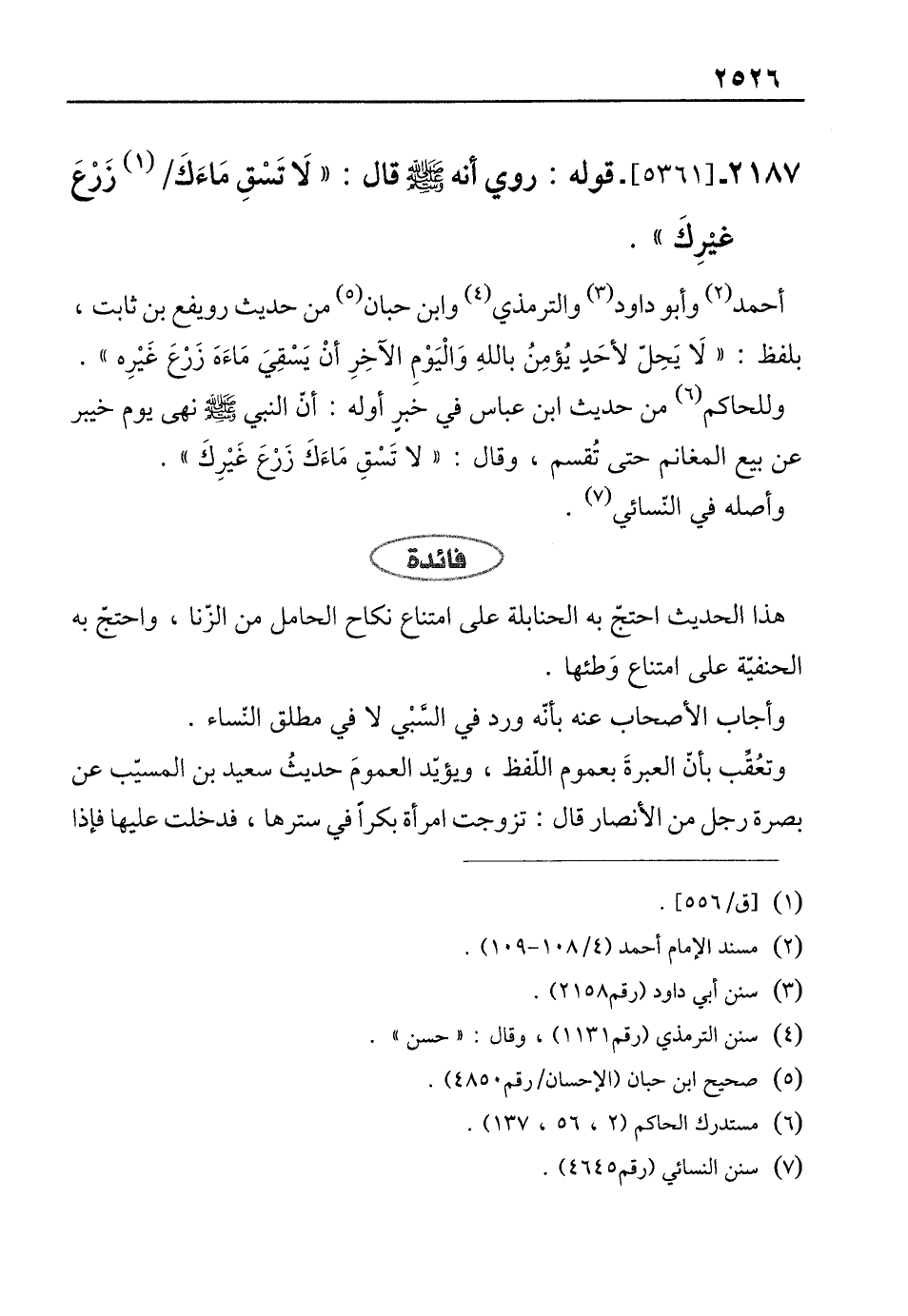 أحمد (¬2) وأبو داود (¬3) والترمذي (¬4) وابن حبان (¬5) من حديث رويفع بن ثابت، بلفظ: "لاَ يَحِلّ لأحَدٍ يُؤمِنُ باللهِ وَالْيَوْمِ الآخِرِ أنْ يَسْقِيَ مَاءَهَ زَرْعَ غَيْرِه".