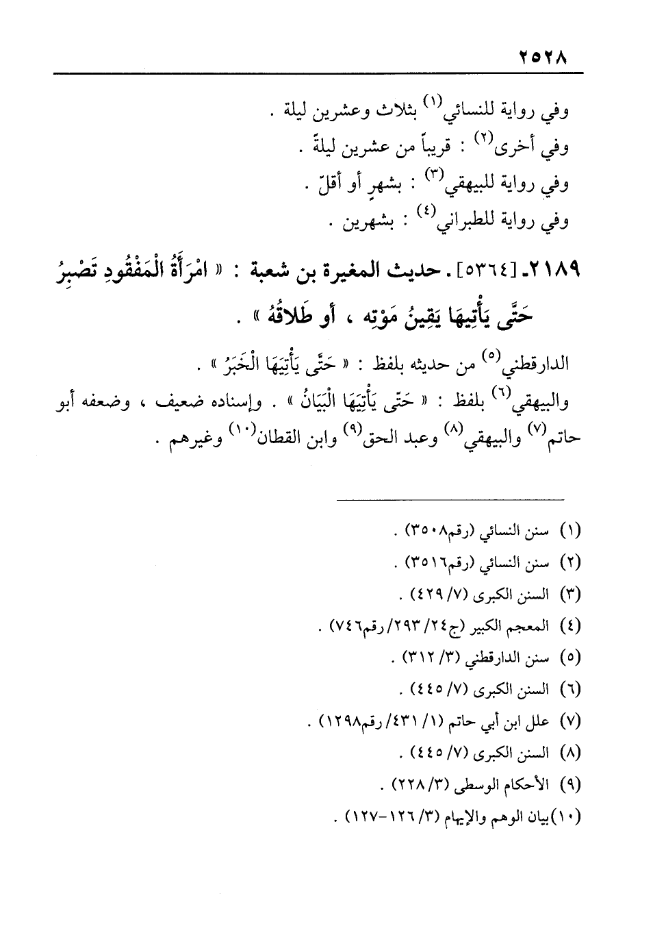 2189 - [5364]- حديث المغيرة بن شعبة: "امْرَأَةُ الْمَفْقُودِ تَصْبِرُ حَتَّى يَأْتِيهَا يَقِينُ مَوْته، أو طَلاقُهُ".
