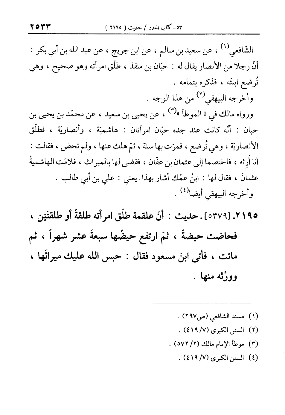 الشّافعي (¬1)، عن سعيد بن سالم، عن ابن جريج، عن عبد الله بن أبي بكر: أنّ رجلا من الأنصار يقال له: حبّان بن منقذ، طلق امرأته وهو صحيح، وهي تُرضع ابنتَه، فذكره بتمامه.