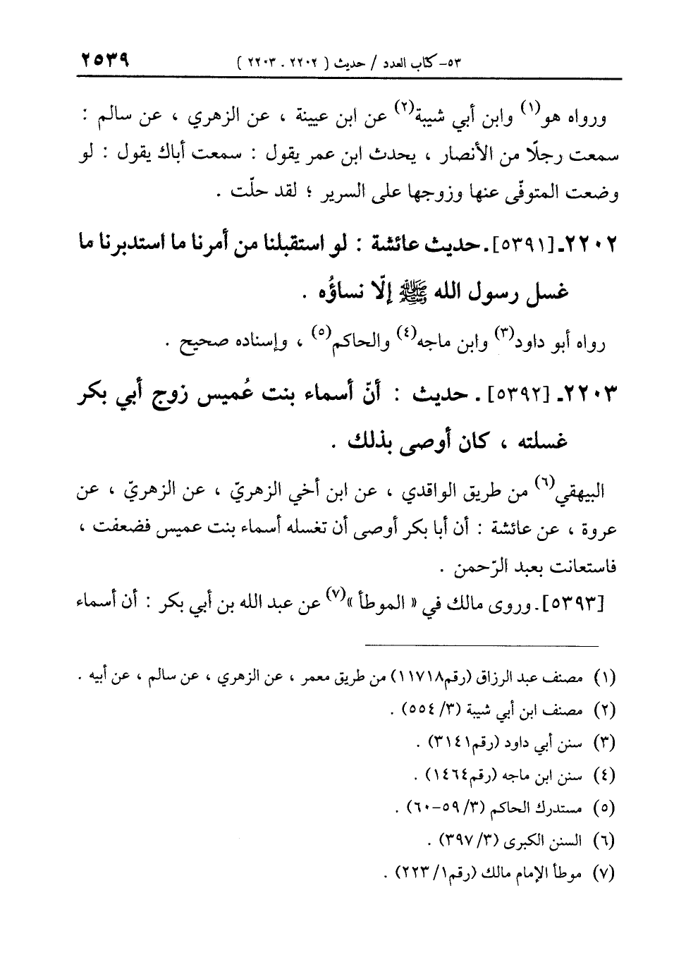 2203 - [5392]- حديث: أنّ أسماء بنت عميس زوج أبى بكر غسلته، كان أوصى بذلك.