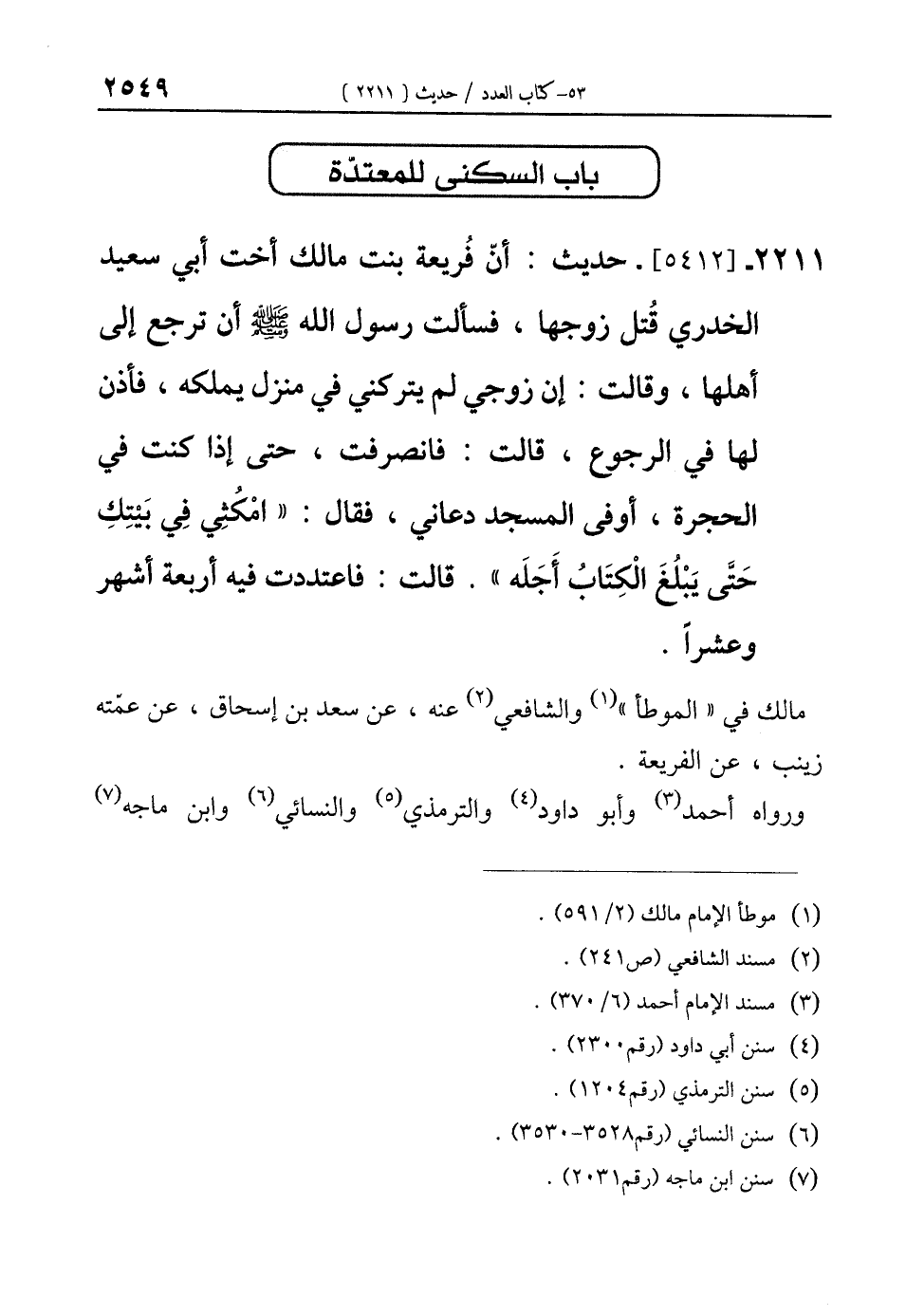 2211 - [5412]- حديث: أنّ فُريعة بنت مالك أخت أبي سعيد الخدري قُتل زوجها، فسألت رسول الله - صلى الله عليه وسلم - أن ترجع إلى أهلها، وقالت: إن زوجي لم يتركني في منزل يملكه، فأذن لها في الرجوع، قالت: فانصرفت، حتى إذا كنت في الحجرة، أو في المسجد دعاني، فقال: "امْكُثِي في بَيْتِكِ حَتَّى يَبْلُغَ الْكِتَابُ أَجَلَه". قالت: فاعتددت فيه أربعة أشهر وعشرًا.