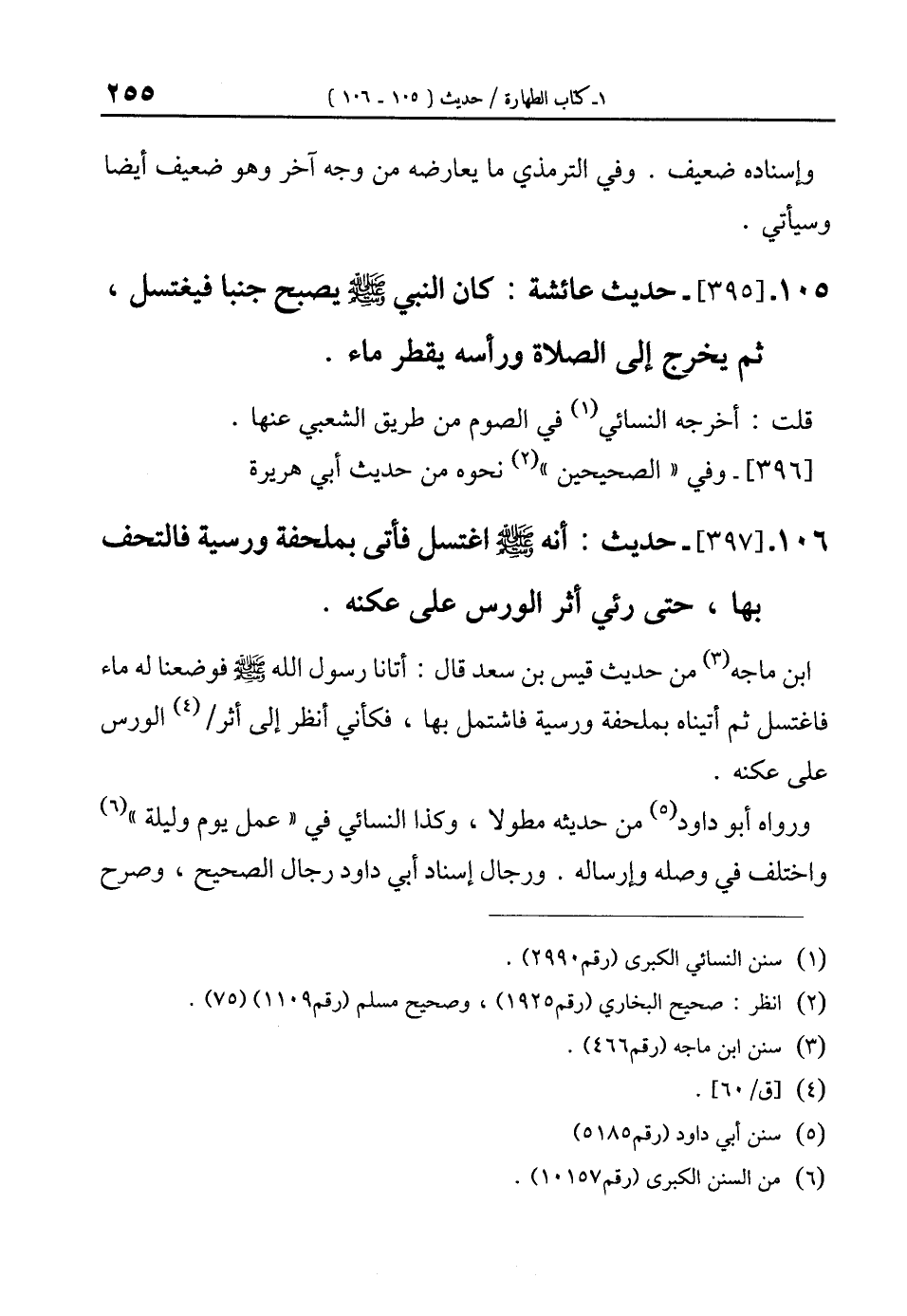 106 - [397]- حديث: أنه - صلى الله عليه وسلم - اغتسل فأتى بملحفة ورسية فالتحف بها، حتى رئي أثر الورس على عكنه.