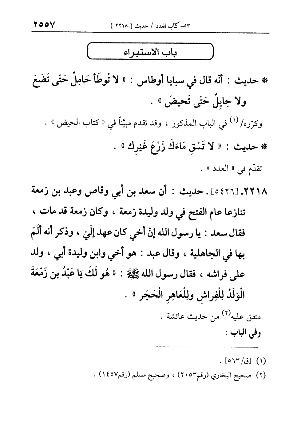 2218 - [5426]- حديث: أن سعد بن أبي وقاص وعبد بن زمعة تنازعا عام الفتح في ولد وليدة زمعة، وكان زمعة قد مات، فقال سعد: يا رسول الله إنّ أخي كان عهد إلَيّ، وذكر أنه ألَمّ بها في الجاهلية، وقال عبد: هو أخي وابن وليدة أبي، ولد على فراشه، فقال رسول الله - صلى الله عليه وسلم -: "هُو لَكَ يَا عَبْدُ بن زَمْعَةَ الْوَلَدُ لِلْفِراشِ ولِلْعَاهِرِ الْحَجَر".