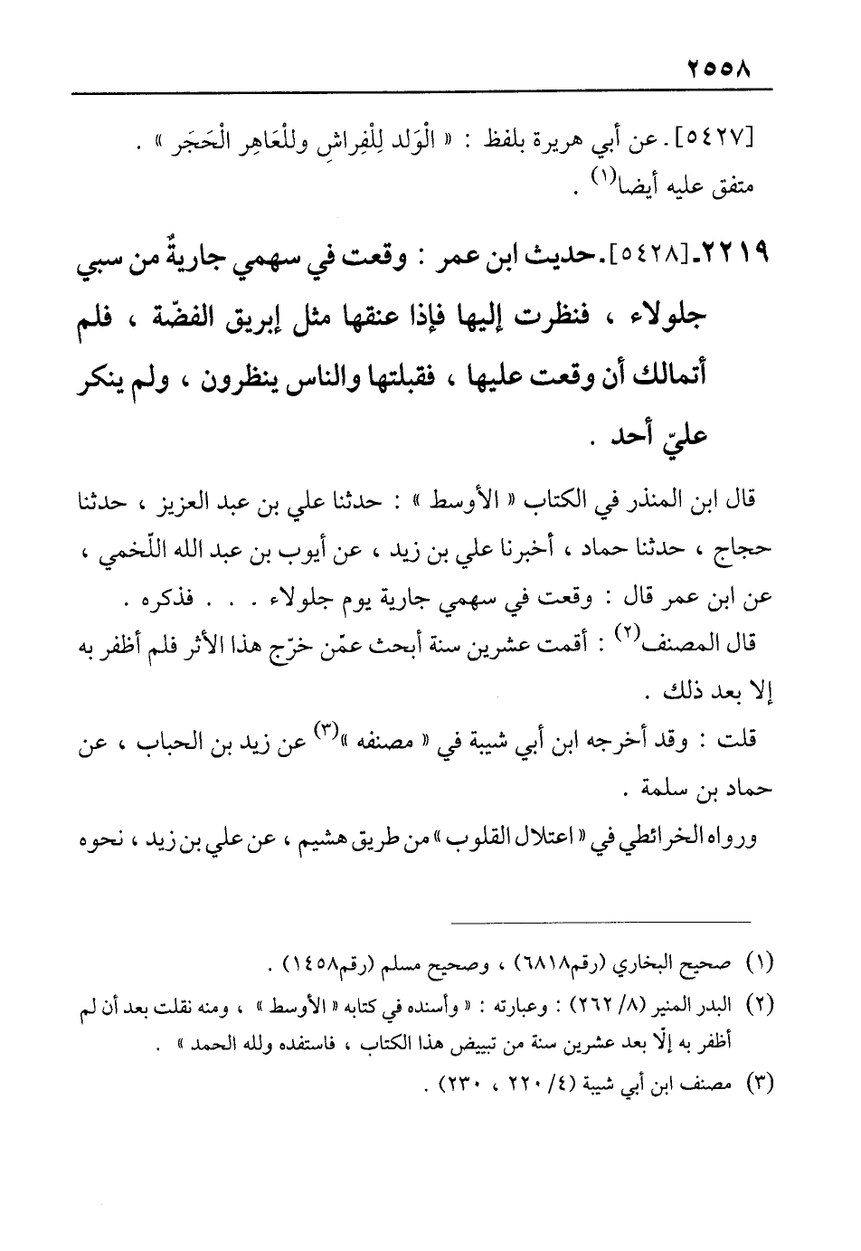 قال ابن المنذر في الكتاب "الأوسط": حدثنا علي بن عبد العزيز، حدثنا حجاج، حدثنا حماد، أخبرنا علي بن زيد، عن أيوب بن عبد الله اللّخمي، عن ابن عمر قال: وقعت في سهمي جارية يوم جلولاء ... فذكره.