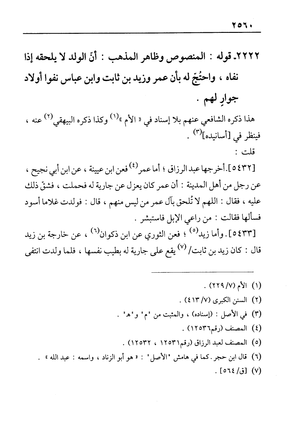 2222 - قوله: المنصوص وظاهر المذهب: أنّ الولد لا يلحقه إذا نفاه، واحتُجّ له بأن عمر وزيد بن ثابت وابن عباس نفوا أولاد جوارٍ لهم.