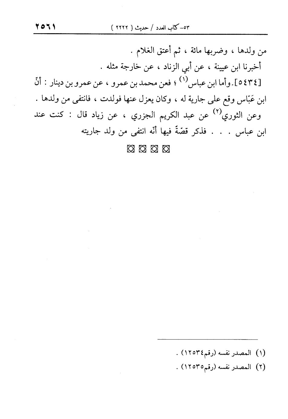 [5434]- وأما ابن عباس (¬1)، فعن محمَّد بن عمرو، عن عمرو بن دينار: أنّ ابن عَبّاس وقع على جارية له، وكان يعزل عنها فولدت، فانتفى من ولدها.